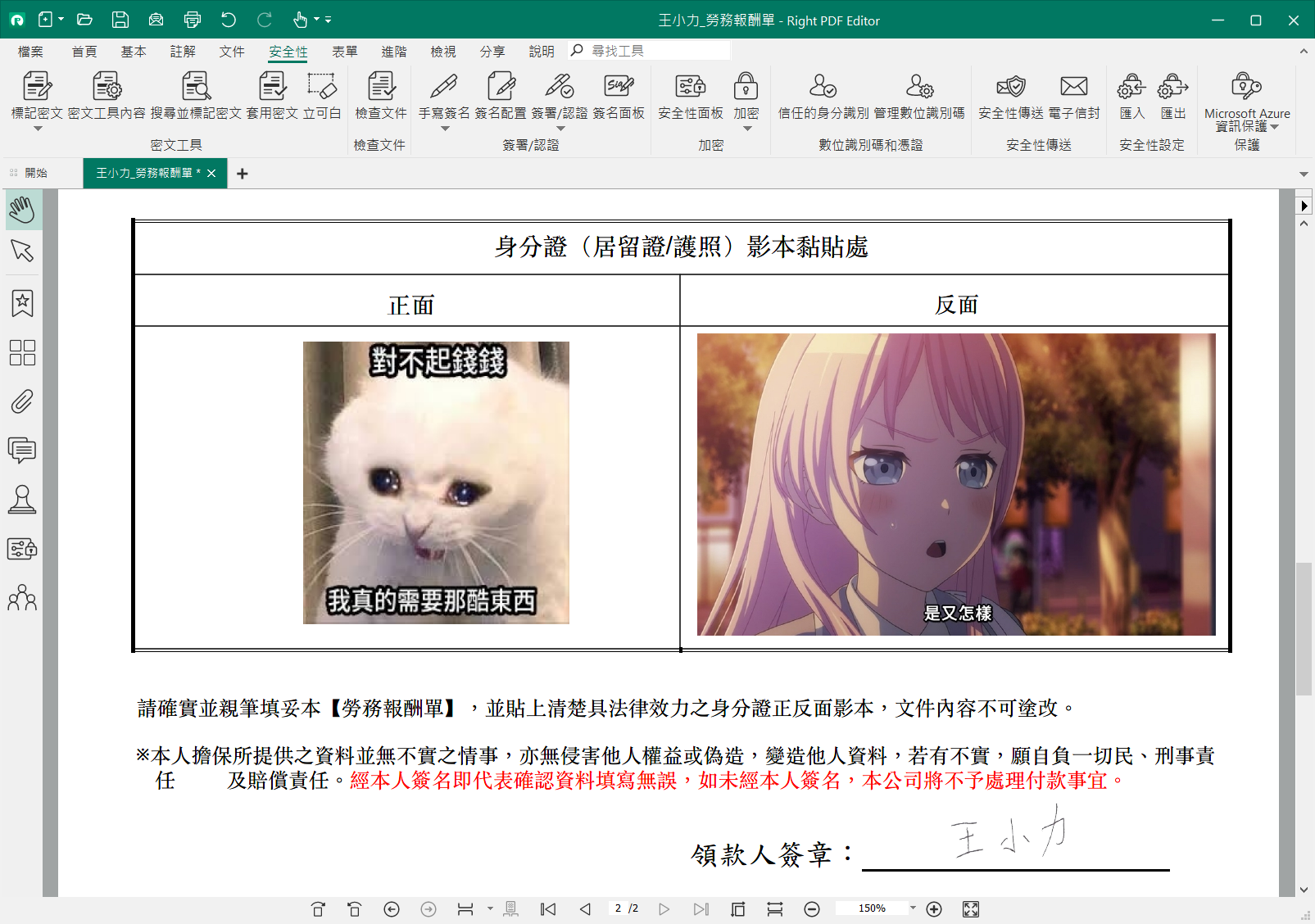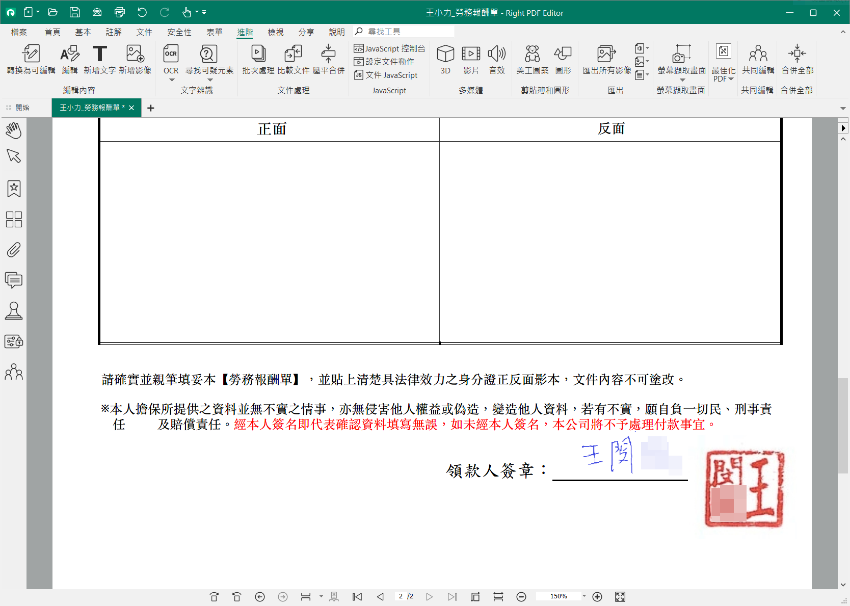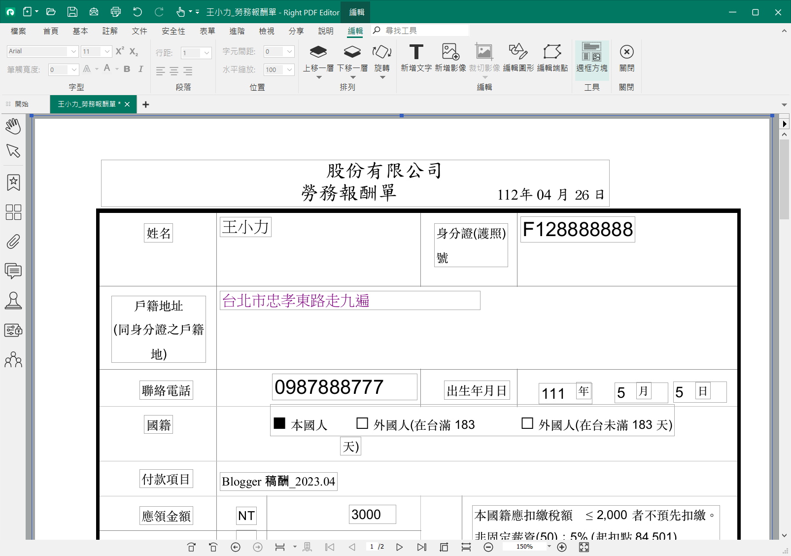 讀入想要編輯處理的 PDF 檔案之後,按下編輯按鈕,就可像處理一般 Word 文件一樣編輯,要新增文字或者新增圖片都是易如反掌,很多自由工作者需要填寫勞報單,偏偏對方寄的都是 PDF 檔案,這時候就派上用場了
