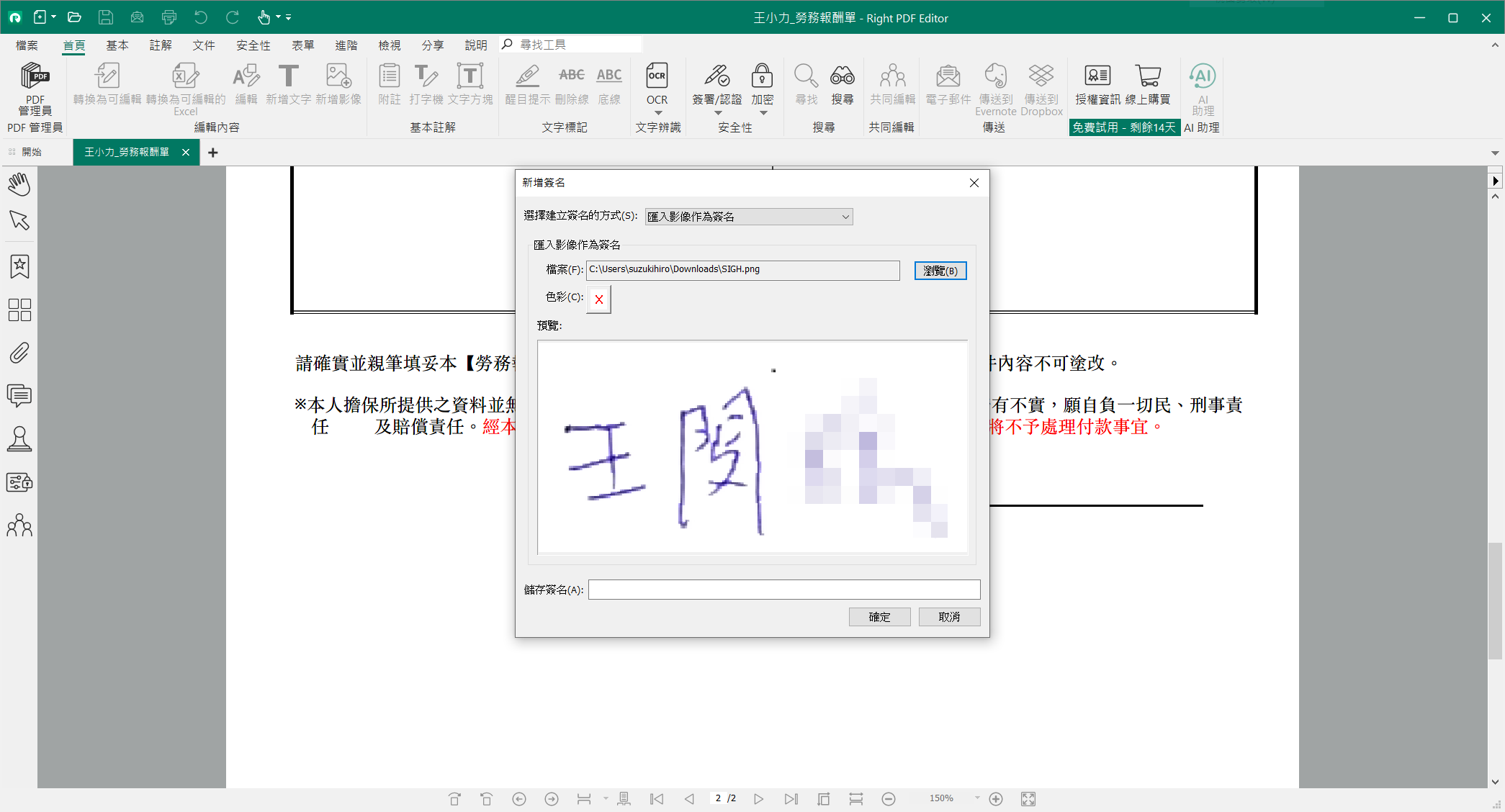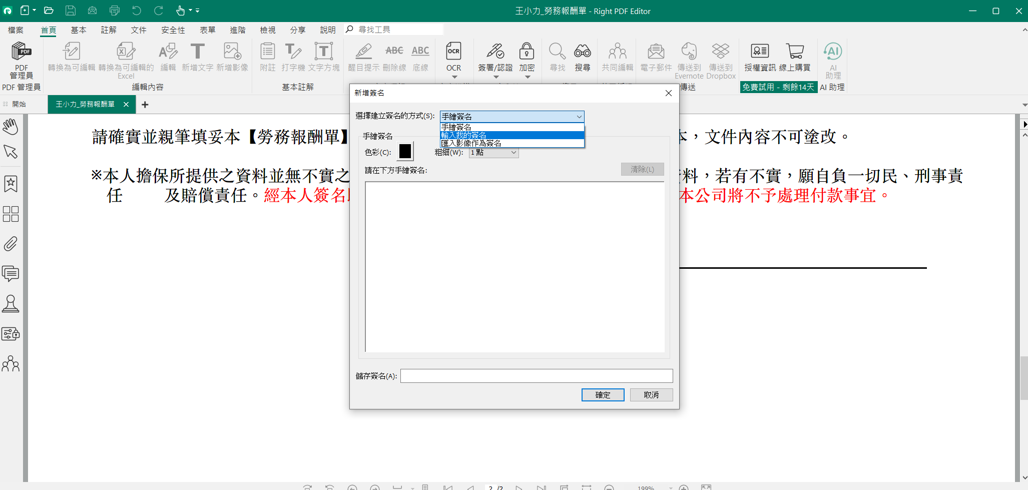另外最為方便的就是電子簽名部分,不少勞報單都是需要列印出來後,簽名上去再掃描成電子檔回寄給對方,說真的是蠻脫褲子放屁的作法,這時候電子簽名就方便不少,棣南 PDF 文電通專業版可匯入圖片製作成電子簽名,也可手繪簽名,方便性大大提升,建議可以先將自己簽名做成圖片掃描檔,之後處理各種線上文件會方便很多。