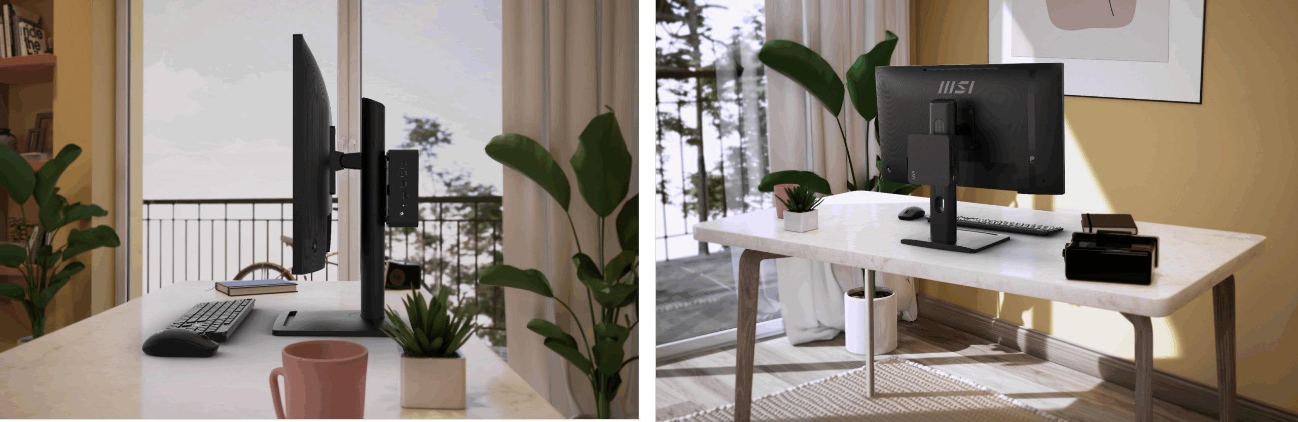 考量到現代辦公空間的多樣性,MSI PRO 系列新機型皆採用四邊窄邊框設計,支援 VESA 壁掛標準,不僅適合多螢幕拼接作業,也可靈活搭配支架、懸臂或牆掛安裝,靈活配置桌面空間,創造更具沉浸感與效率的工作環境。機身內建喇叭,也讓桌面配置更為簡潔有序。