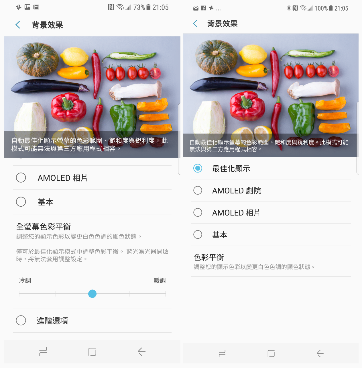 三星今晚也推出了日前說明針對色溫的差異(紅屏)的新版系統更新,實際對比前後版本,新版系統設定中顯示設定(背景效果)的顏色調整(色彩平衡),除了之前就有的顏色調整之外也直接加入了色溫的調整,可以直接拉動調整色溫偏冷還是偏暖。