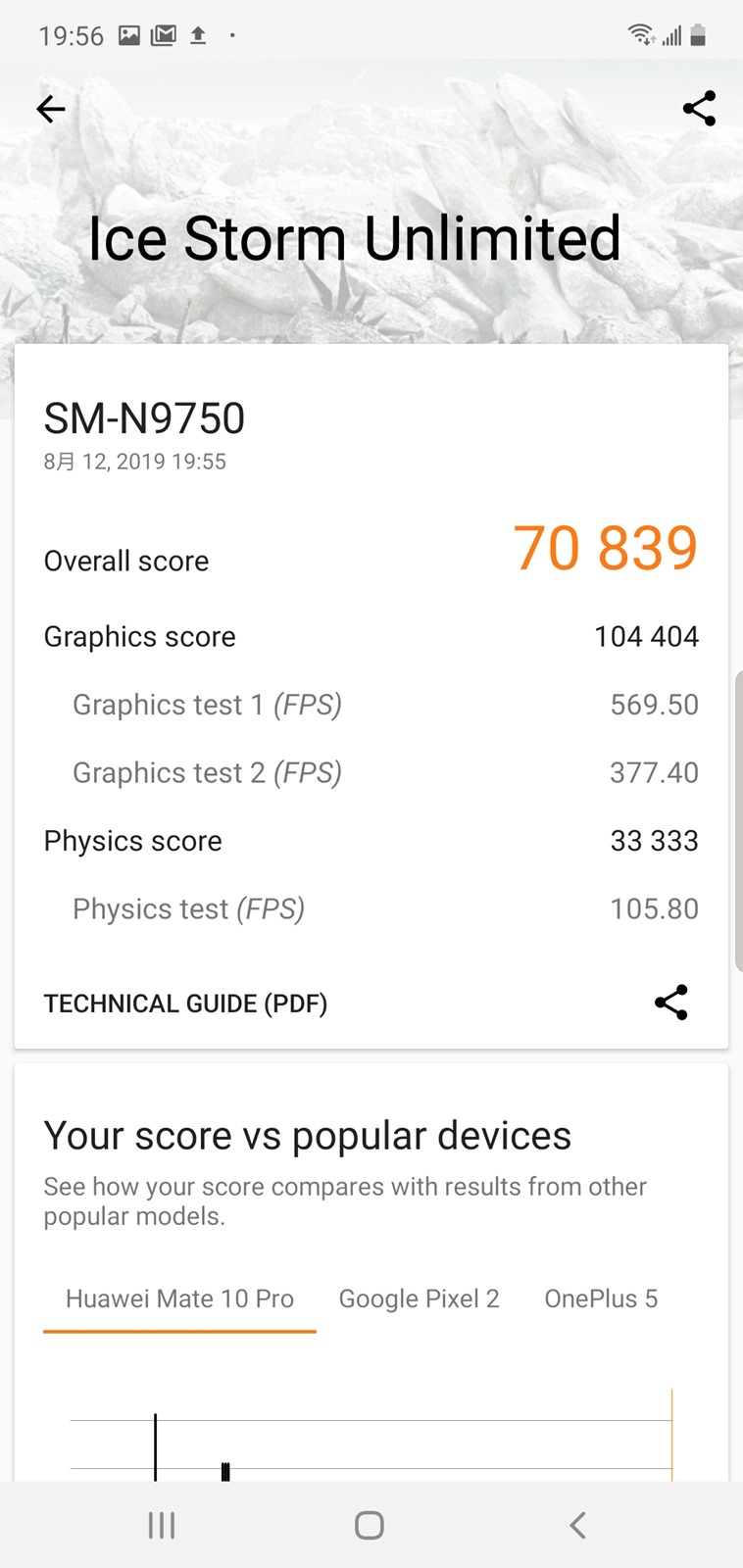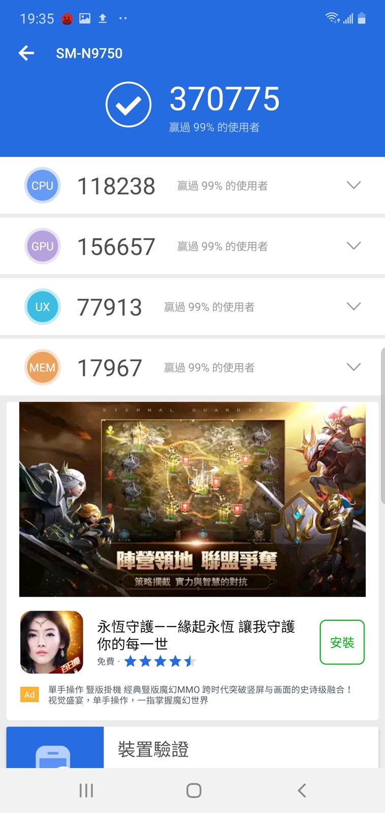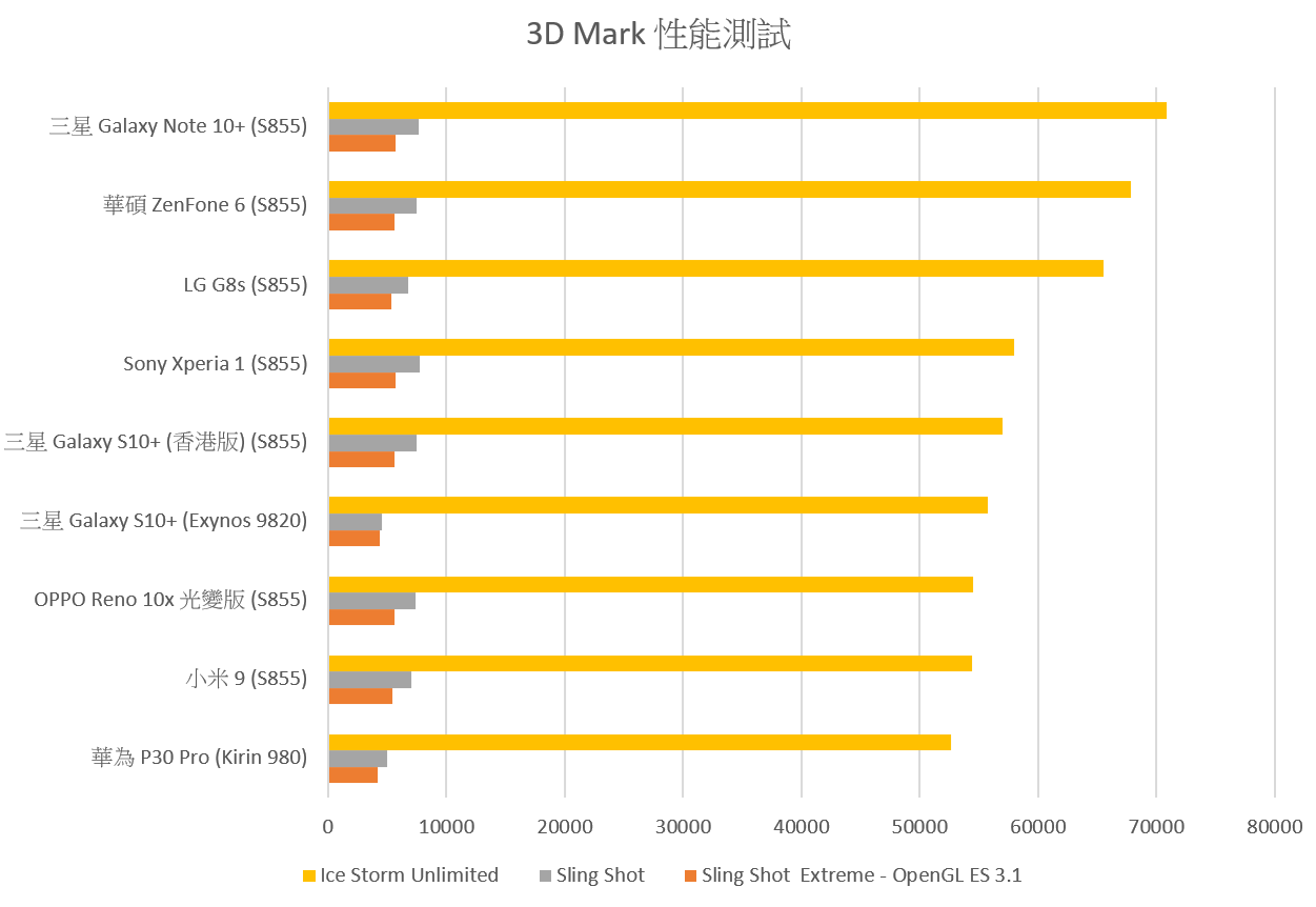 Galaxy Note 10+ 採用 S855 處理器與 12GB 內建記憶體的規格配置,性能測試符合 S855 的高性能表現甚至在 S855 處理器中也是前段班表現;更多資料也可以阿輝資料庫 https://reurl.cc/MxdjK ,資料庫中包含超過 270 支以上以上阿輝多年測試的實測數據,可以給大家作為對照參考使用。