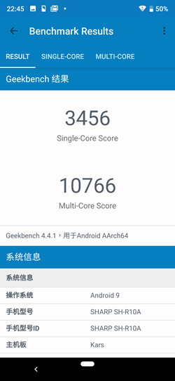 阿輝實際測試 AQUOS R3 內建電池容量為 3230 mAh,實測電力部分以 PCMARK 做標準測試,測試 80% ~ 20% 間的電力運行,模擬上網、工作、遊戲的混合應用,測試結果為 9 小時 49 分鐘,測試方式與標準可以參考這篇說明。