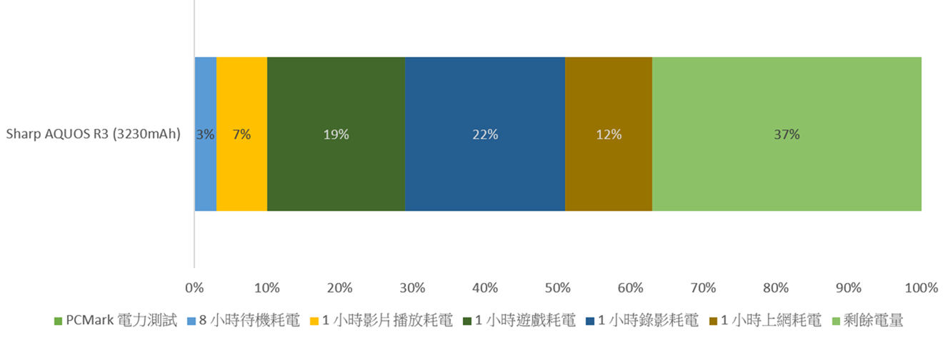 - AQUOS R3 瀏覽器連續讀取瀏覽 1 小時,實際消耗 12% 電量,剩餘 37% 電量