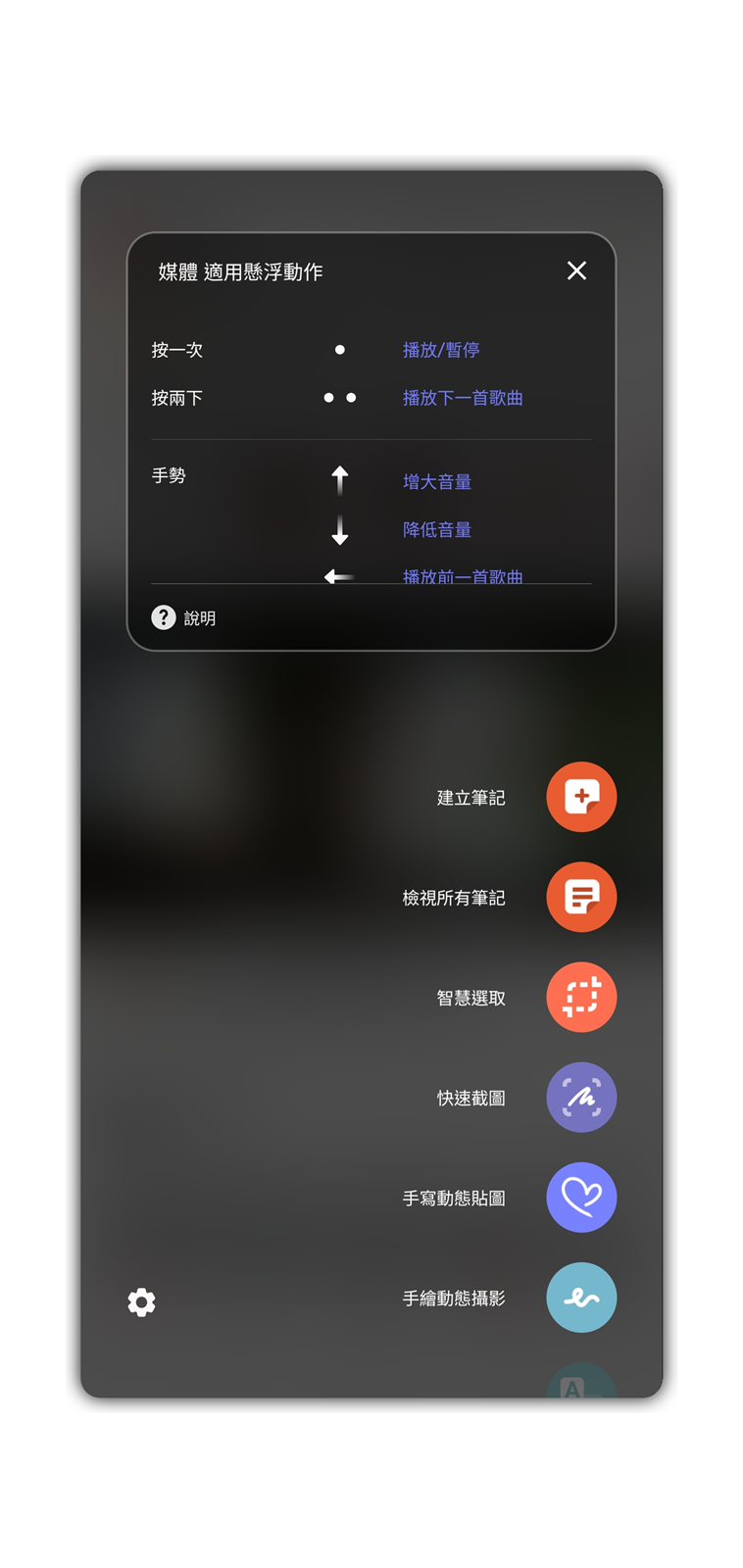 而 S Pen 的按鈕與動作也會依照不同的情境 (應用程式有不同的操作功能),例如播放音樂或是影片播放時,S Pen 就會變成無線遙控器一般。