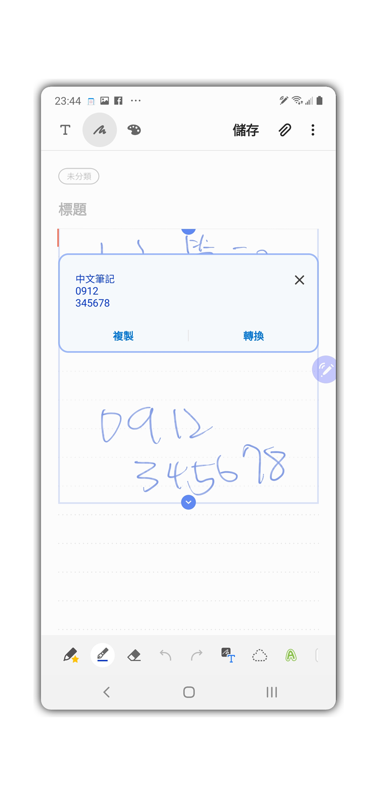 然後現在 S Pen 手寫後也可以快速點選工具列上的文字識別,直接將手寫的中英文識別轉換成文字方便分享或是搜尋,這點像是阿輝常常接電話的時候需要臨時做一下筆記記錄電話、地址、工作項目等資訊,就可以很方便的快速轉換成文字來寄送 Email 或是加入行事曆。