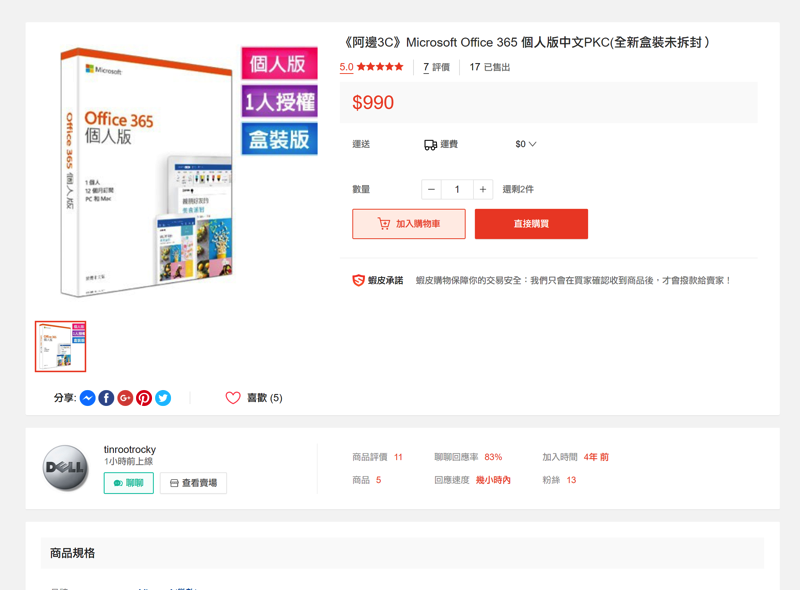 而且各大網拍上長年都有便宜的 Office 365 個人版序號甚至盒裝可以購買,以今天阿輝隨便搜尋找到的 990 含運的盒裝來算,只要 990 就可以換到家用版九個月,等於一個月只要一百多,就可以使用 Office 365 家用版完整服務,合法給五個使用者使用,又可以設定帳號分享,還支援 Win/Mac 雙系統,算下來一台電腦,一天只要 0.7 元就可以合法使用 Office 的完整功能!有這種價格,誰還要苦哈哈的下載盜版呢?