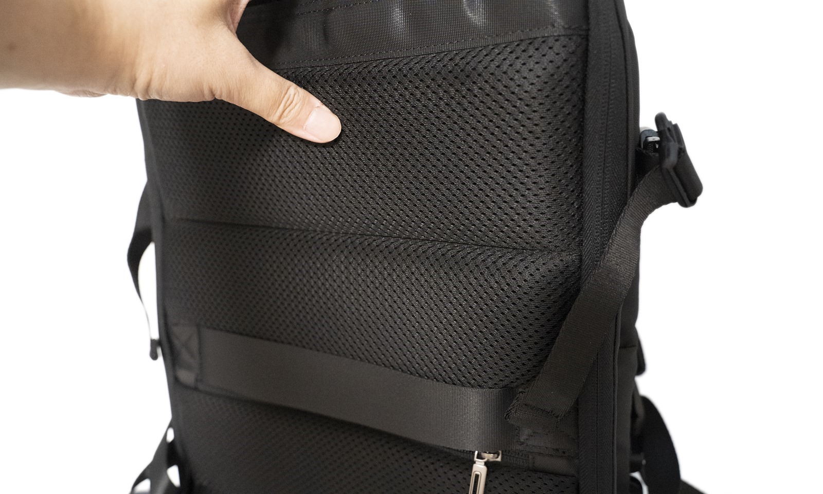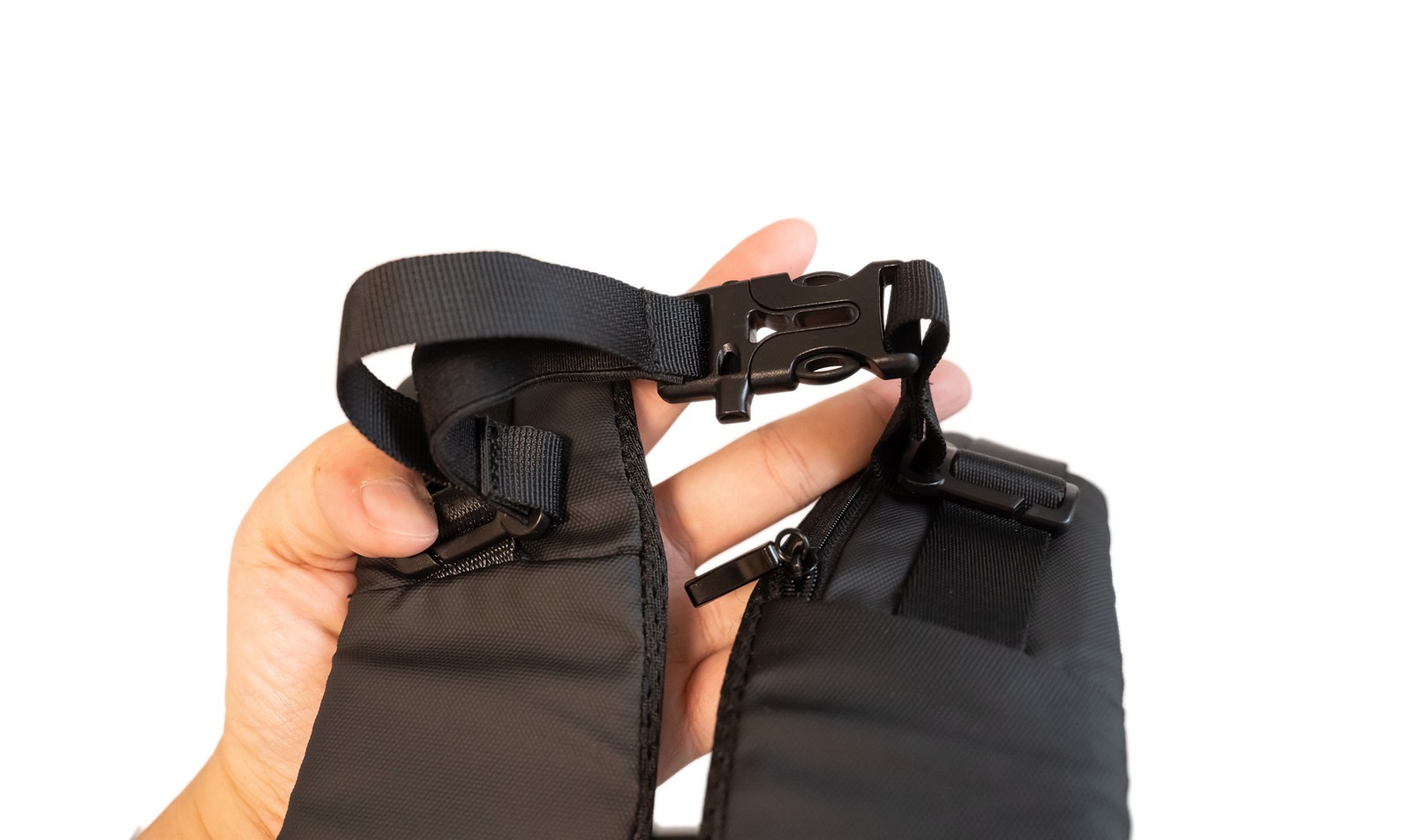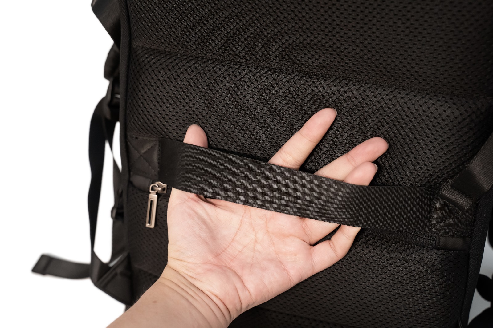 剛剛就有提過 Nayo EXP 可以肩背也可以手提,雖然尺寸不小,但男女皆宜,不管怎麼背都好看又舒適,裝滿後還可以把胸前扣環扣起,增加穩定度也把重量更平均分擔,感覺更輕鬆。