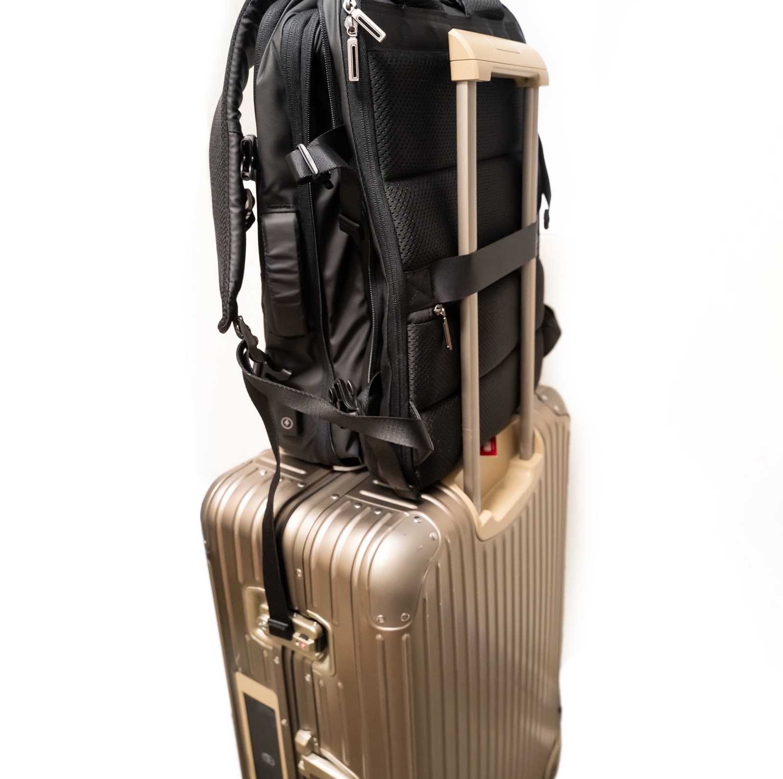 而且可以直接用束帶固定在行李箱上還有個好處,某些治安不好的國家會有竊賊或強盜,假裝不經意地把旅客放在行李箱上方的背包整個直接提走,如果固定在行李箱上等於是多一層保護,竊賊遠遠看見就會選擇其他更容易得手的目標,就算硬要偷也會稍微卡一下、拖延偷盜速度,讓人有反應時間。