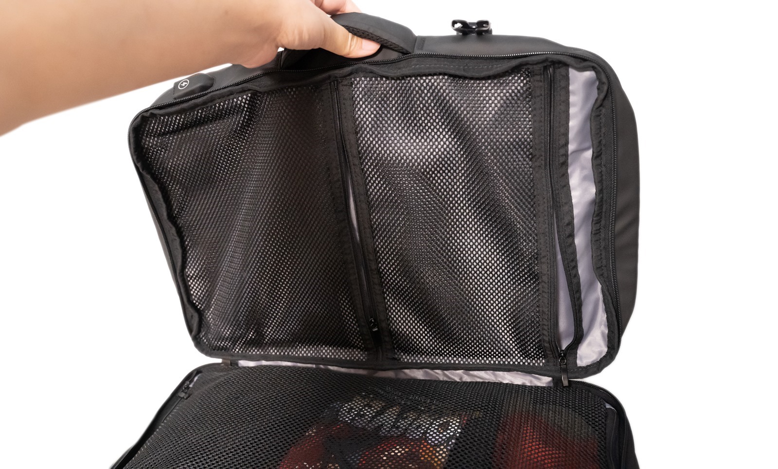 最中間的一層隔間上下都有網狀隔板設計,用來放置電子產品最適合;阿輝在打包行李時,多半都會把比較容易受到碰撞傷害或是摩擦的電子用品放在中間,前後兩端都放滿柔軟的衣服來減少震動、增加緩衝,但就是開箱的時候要小心,畢竟完全是用衣物擠壓夾住墊子產品,並不穩固,Nayo EXP 直接在中間層製作網隔,一方面可以固定電子用品讓前後柔軟的結構與物品保護它,就算是空箱也能把電子產品維持在中間最安全的位置。
