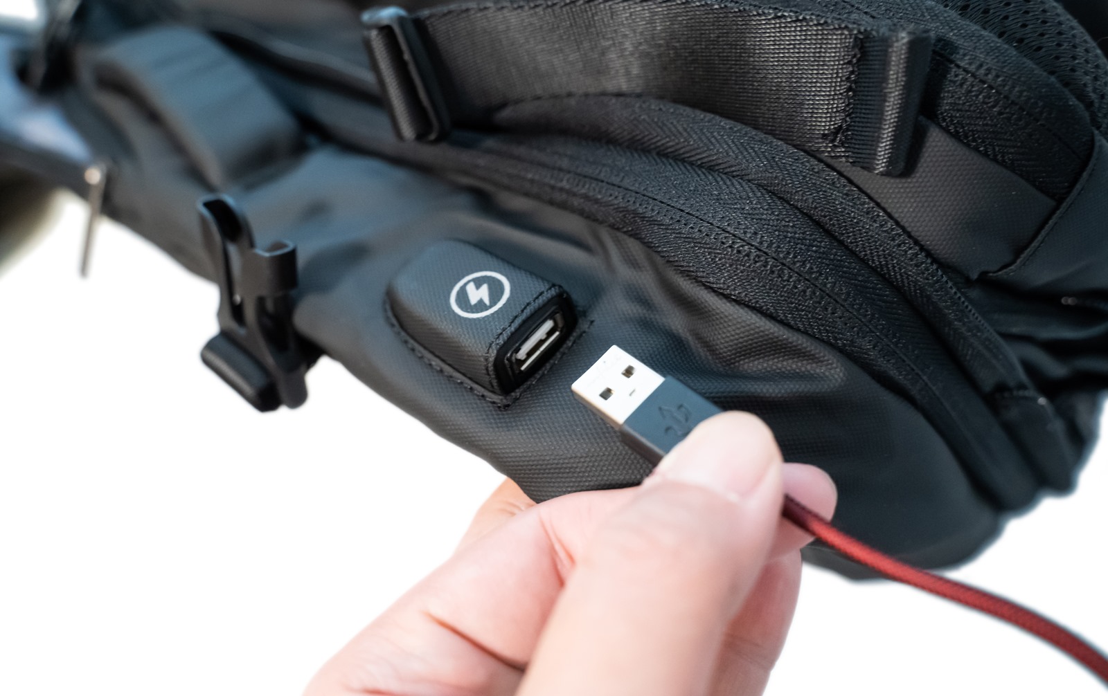 只要把行動電源接好線,放在靠近外接充電埠的格子中,就能安心地從外面接電了。