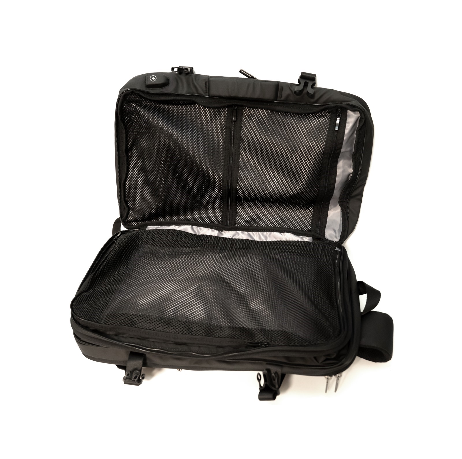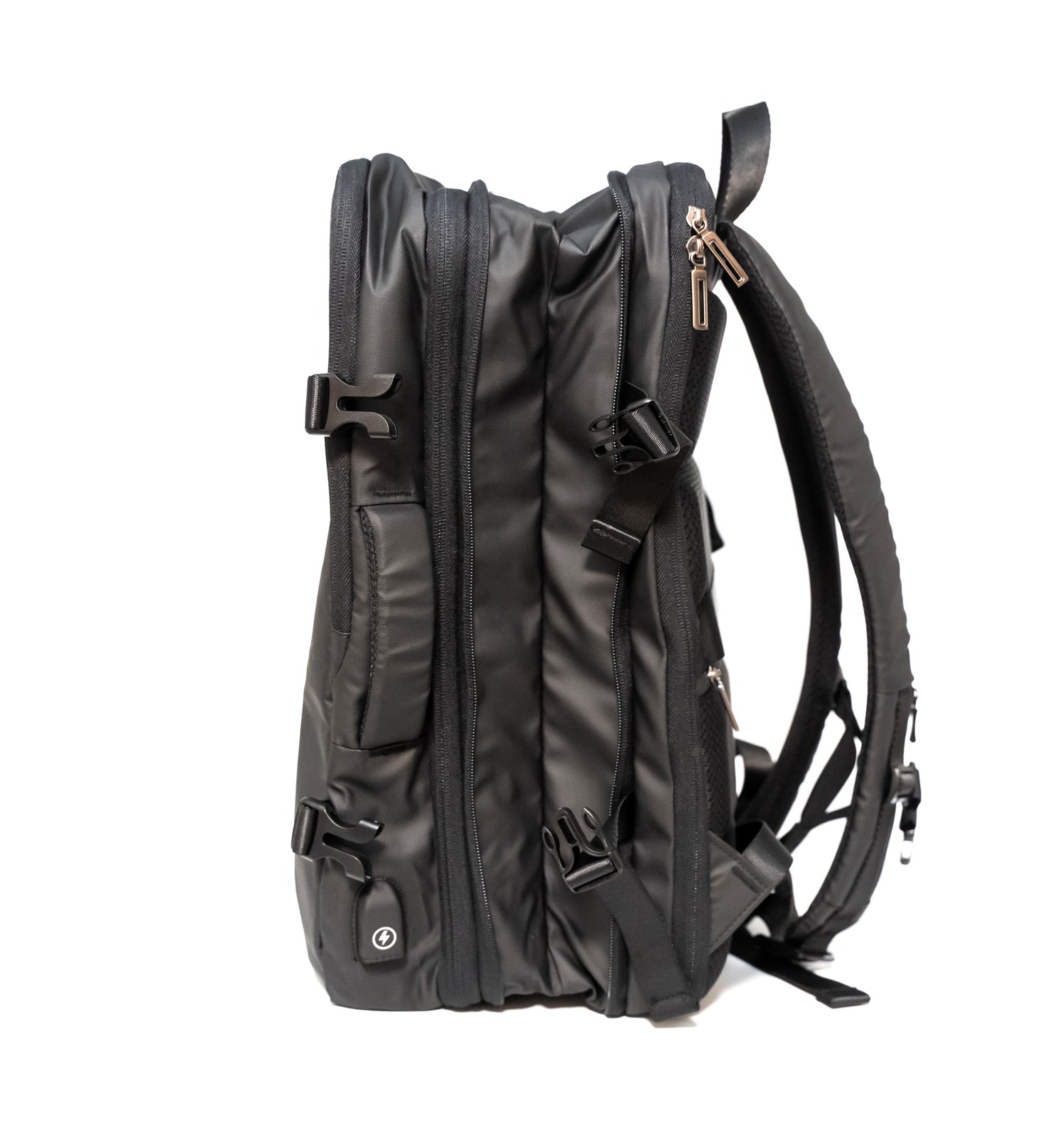 沒錯!Nayo EXP 可以縮小!大多的包包都不太能調整大小,即使可以也就是拉開一個側邊拉鍊稍微增加空間罷了,但 Nayo EXP 背包的空間擴充完全不是同一個檔次,在縮到小的狀況下,體積既小又扁,可以簡單地放在行李箱或是登機箱中作為預備的置物空間之用。