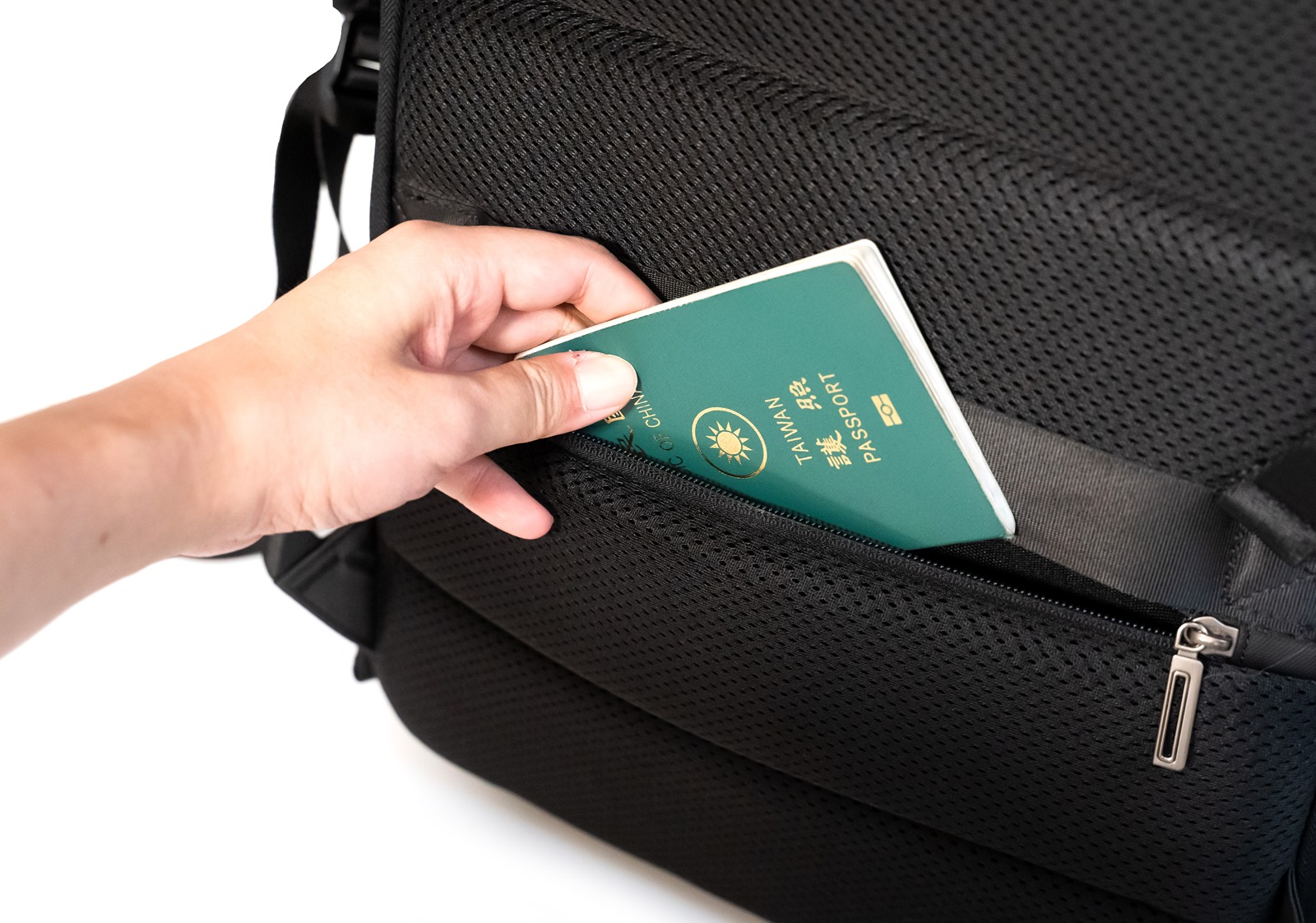 而在背後平常會緊靠背部的位置,還有設計一個隱密的拉鍊袋,可以用來放護照等等較為貴重的東西,不只想要取用的時候很方便,那個位置足夠隱密,也不容易被不良份子發現或是偷取,出國旅行時非常重要。