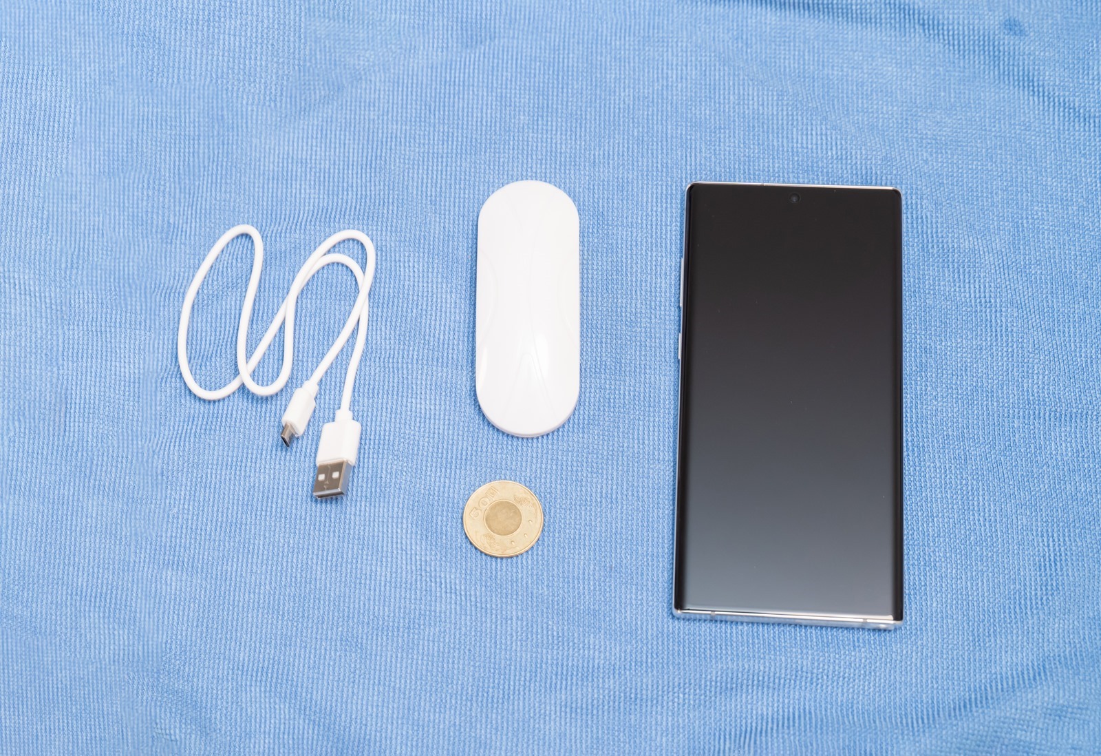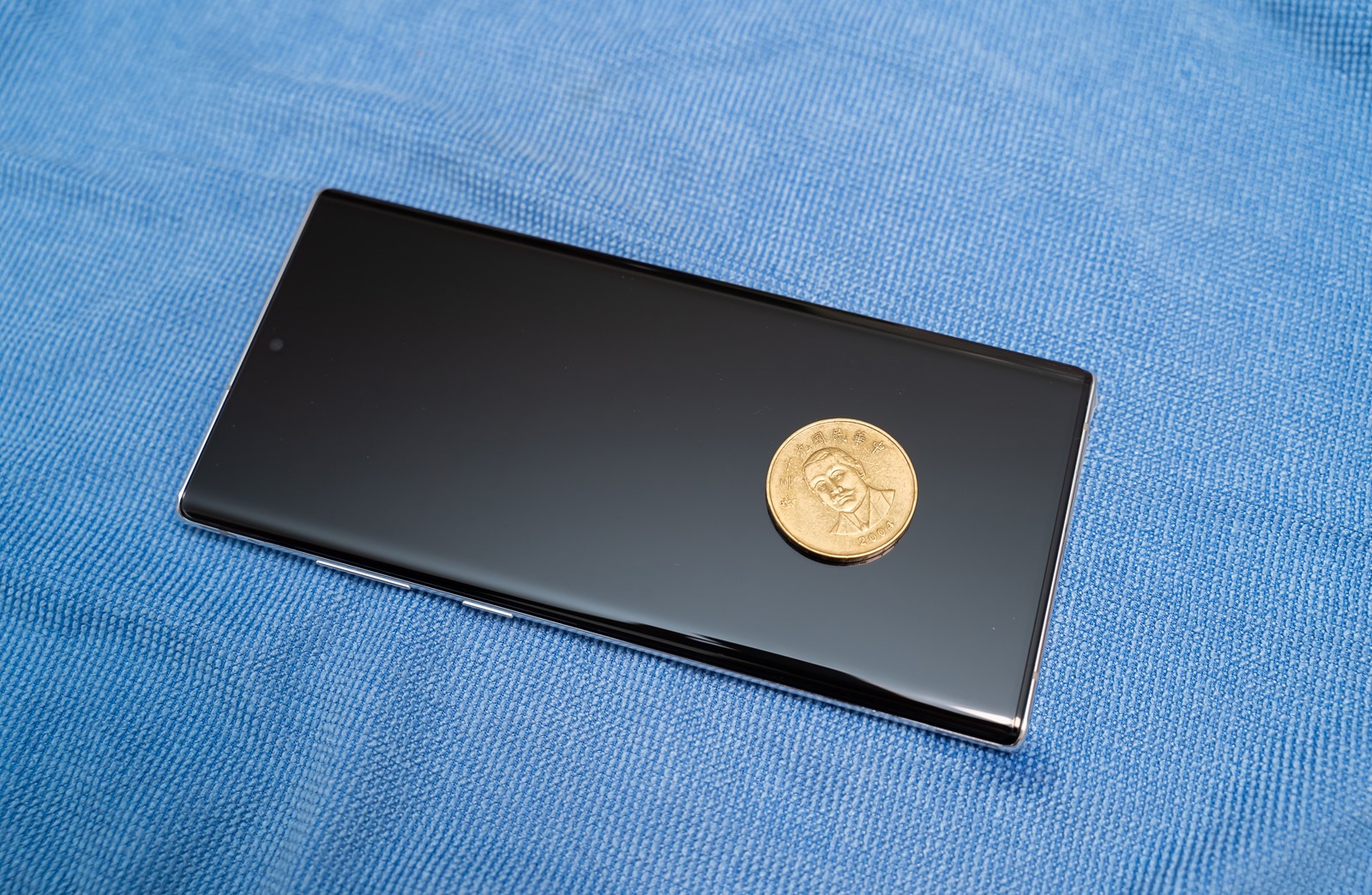 然後準備一個 50 元或是 10 元硬幣,並小心的放在 Note10/10+的螢幕指紋辨識,這個用處是擋住指紋辨識區,讓我們可以將該處最後再照射紫外線固化