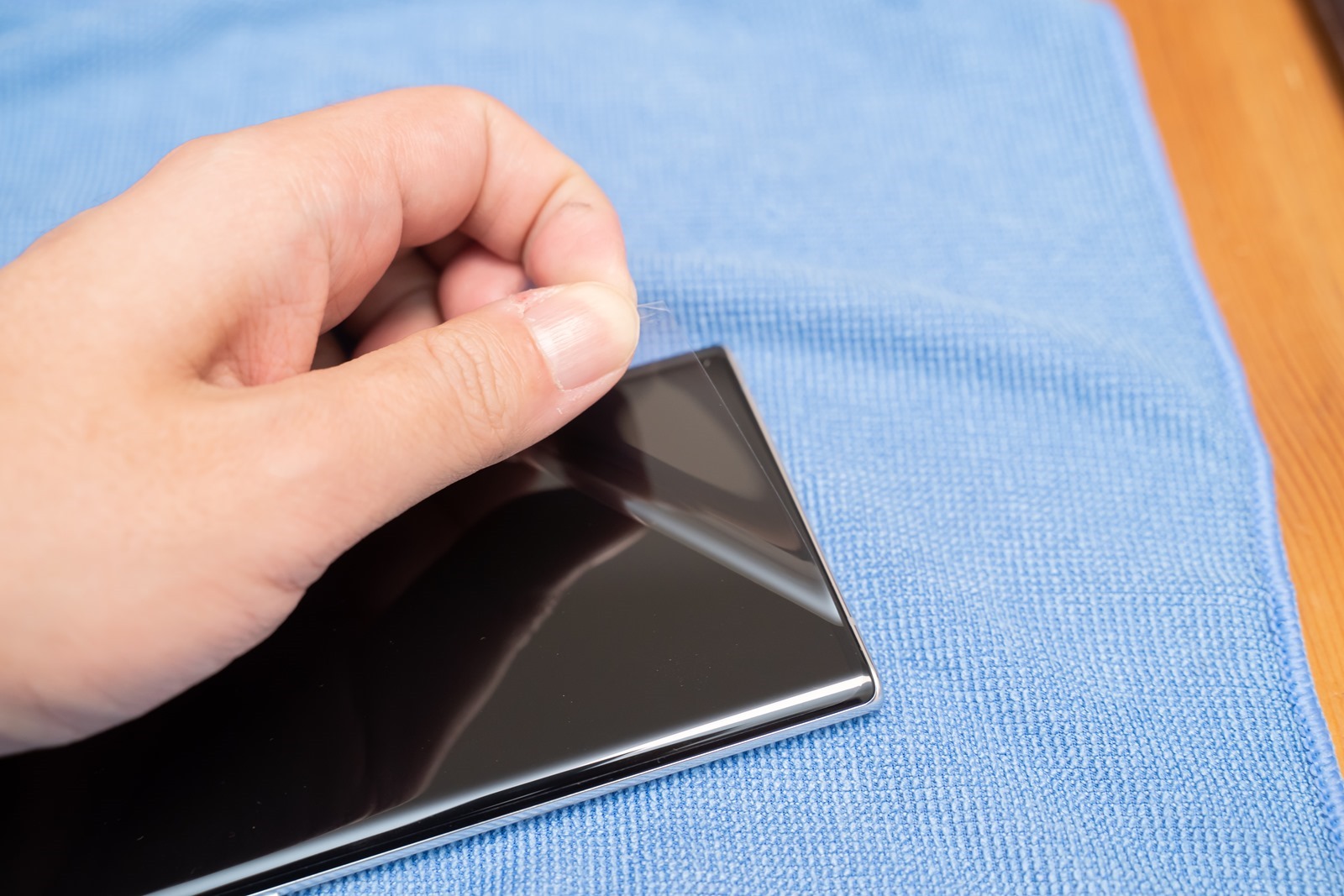 貼保護貼之前先清理手機螢幕,螢幕表面的灰塵與油污一定要清楚乾淨,由於 UV 膠液體的特性其實對於螢幕如果已經有小刮傷甚至會有視覺上填補修復的效果,不過還是建議貼的時候盡量不要有灰塵或是毛髮停留在螢幕上,貼付的成功率較高。