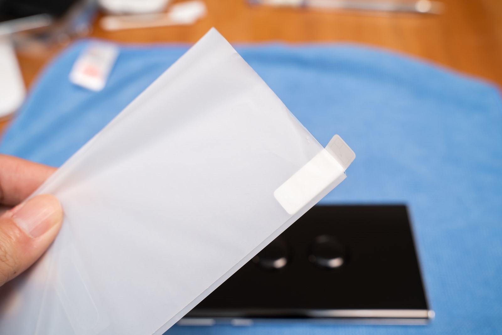 建議大家要自己貼的話,可以準備可以吸水的眼鏡布或是 3M 魔布之類的放在放在水平的桌面,在放上 Note 10 / 10+方便施工,如果不慎有多出的 UV 膠多少可以吸附也比較好事後清理