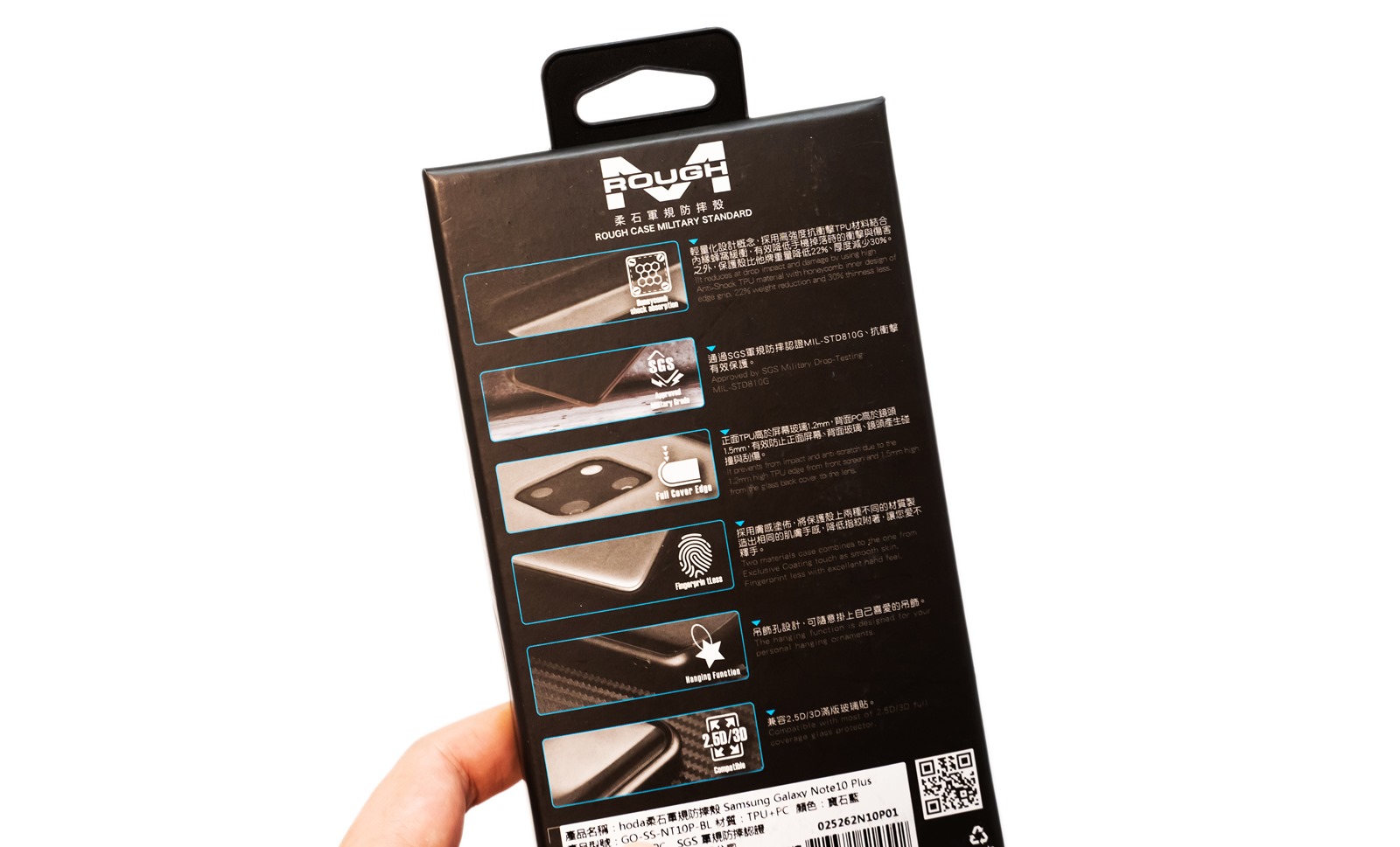 包裝上標示柔石保護殼通過 SGS 軍規級防摔 MIL-STD810G 認證!可以給你 Galaxy Note 10+ 手機強大的保護!