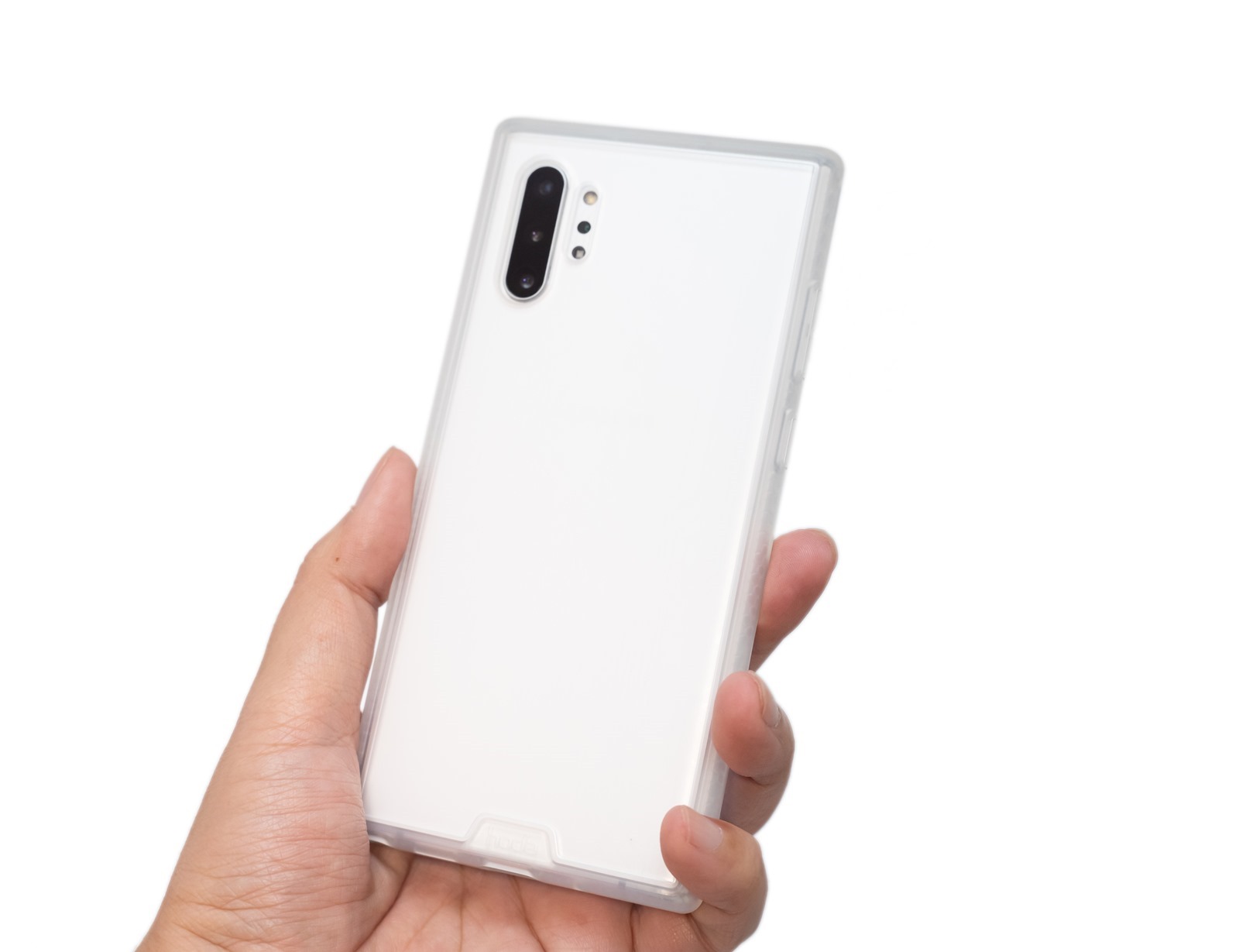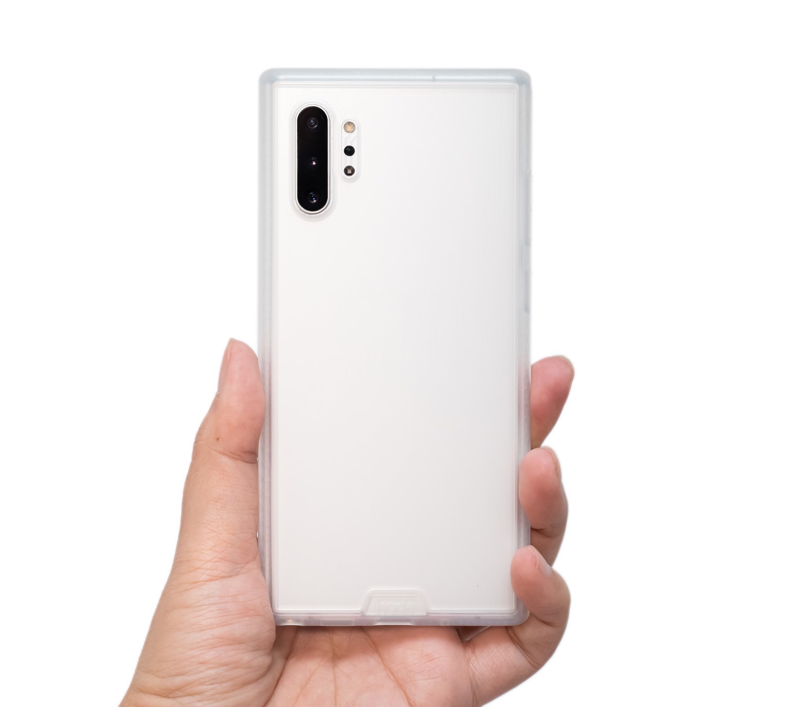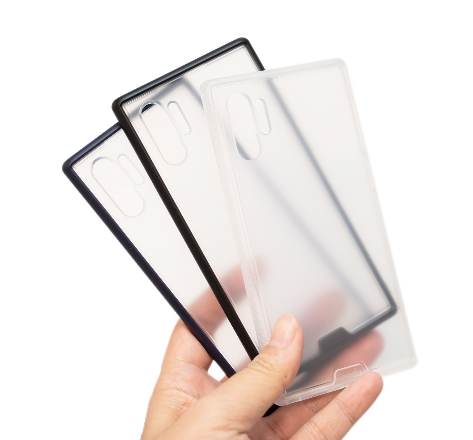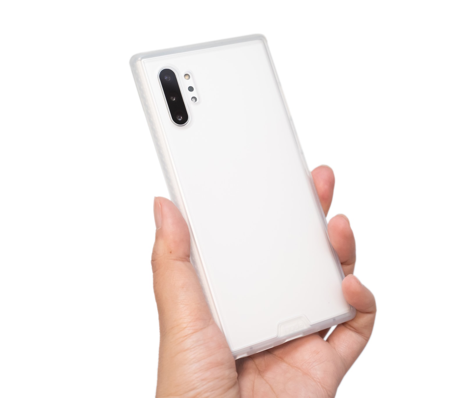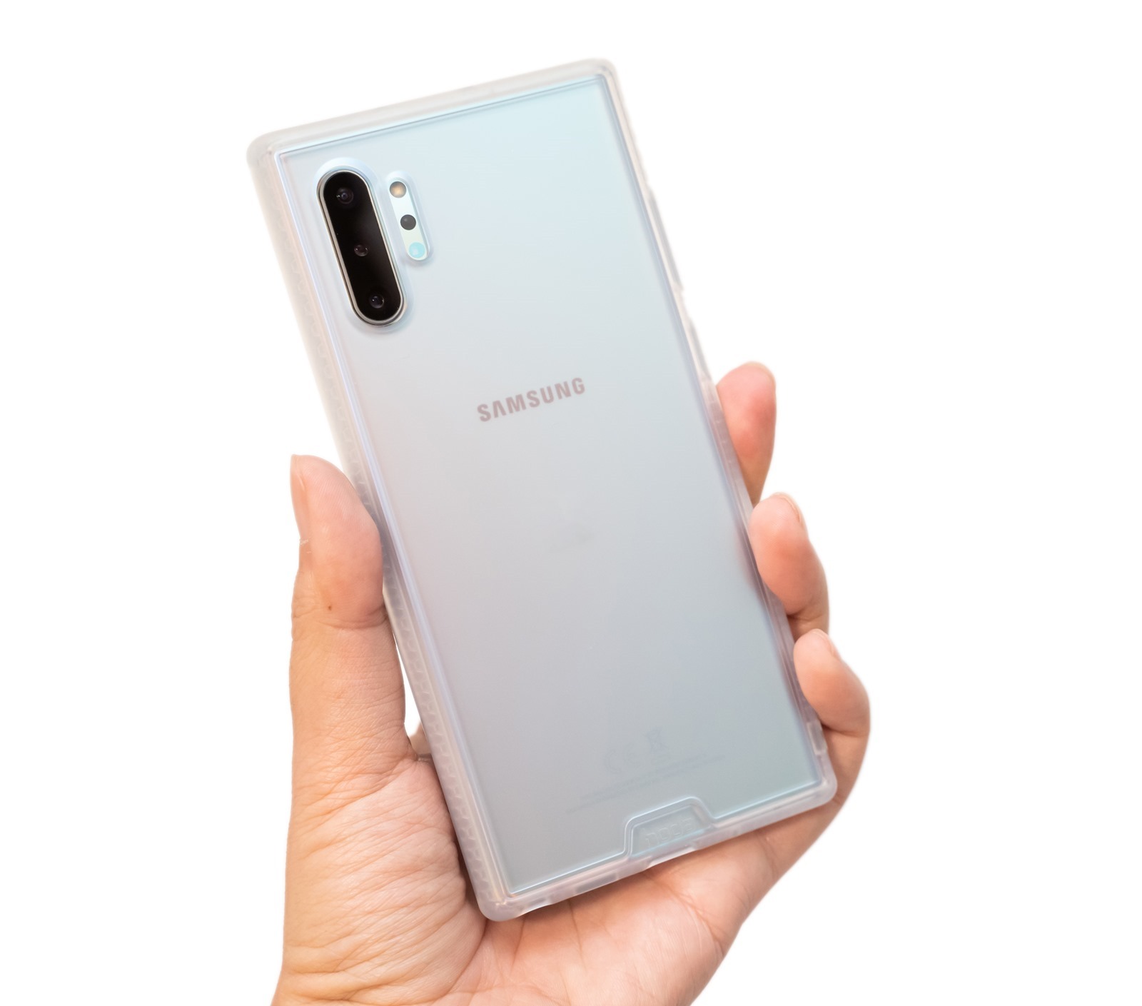 霧透的背蓋設計也可以略為透出手機原本機身的顏色與設計,例如這是 Note10/10+ 銀色機實際裝上的樣子,炫彩的顏色就會隱約顯露出來!保護殼上的 PC 膚感塗佈,滑順抗指紋,使用不留痕跡,摸起來手感又好讓人愛不釋手。