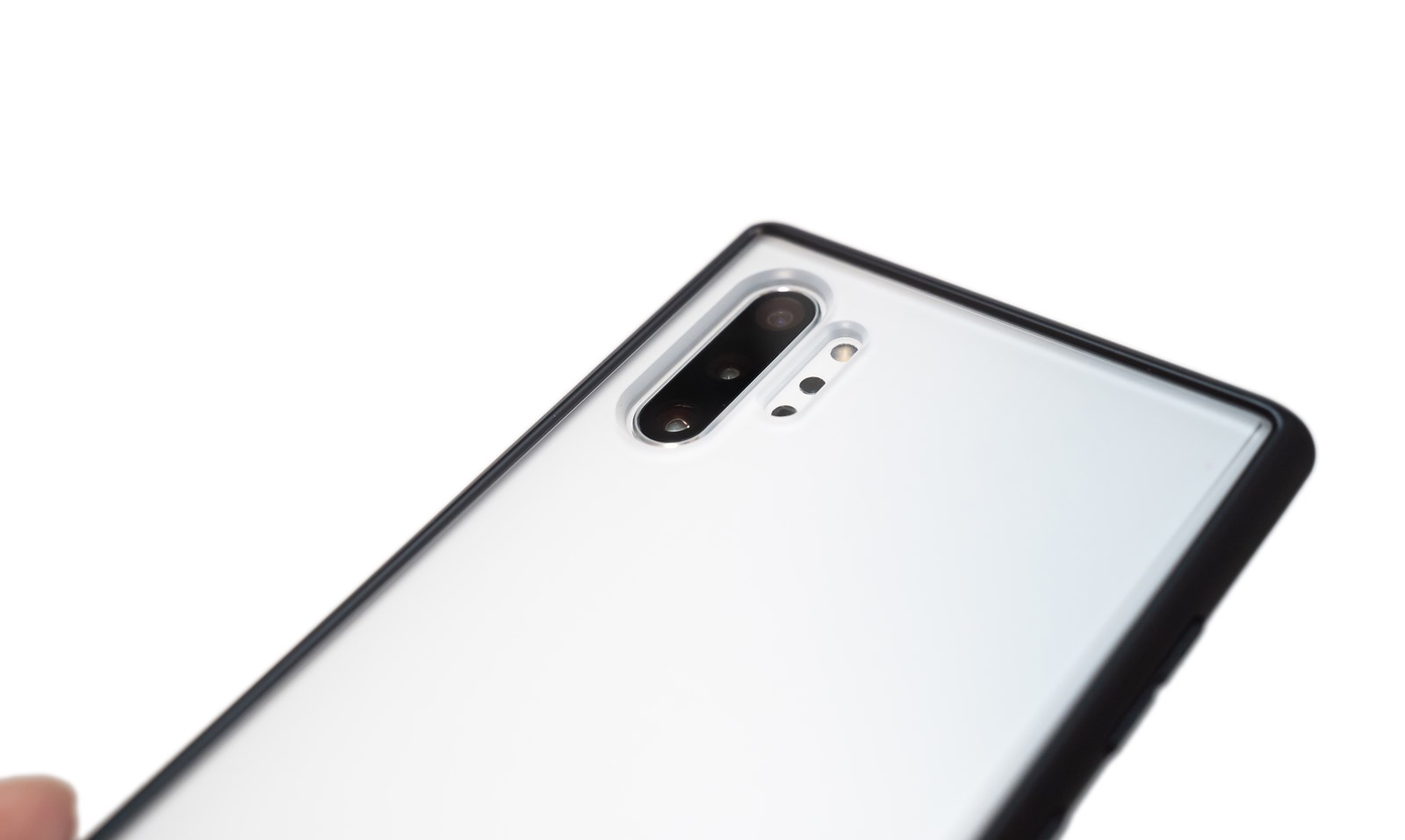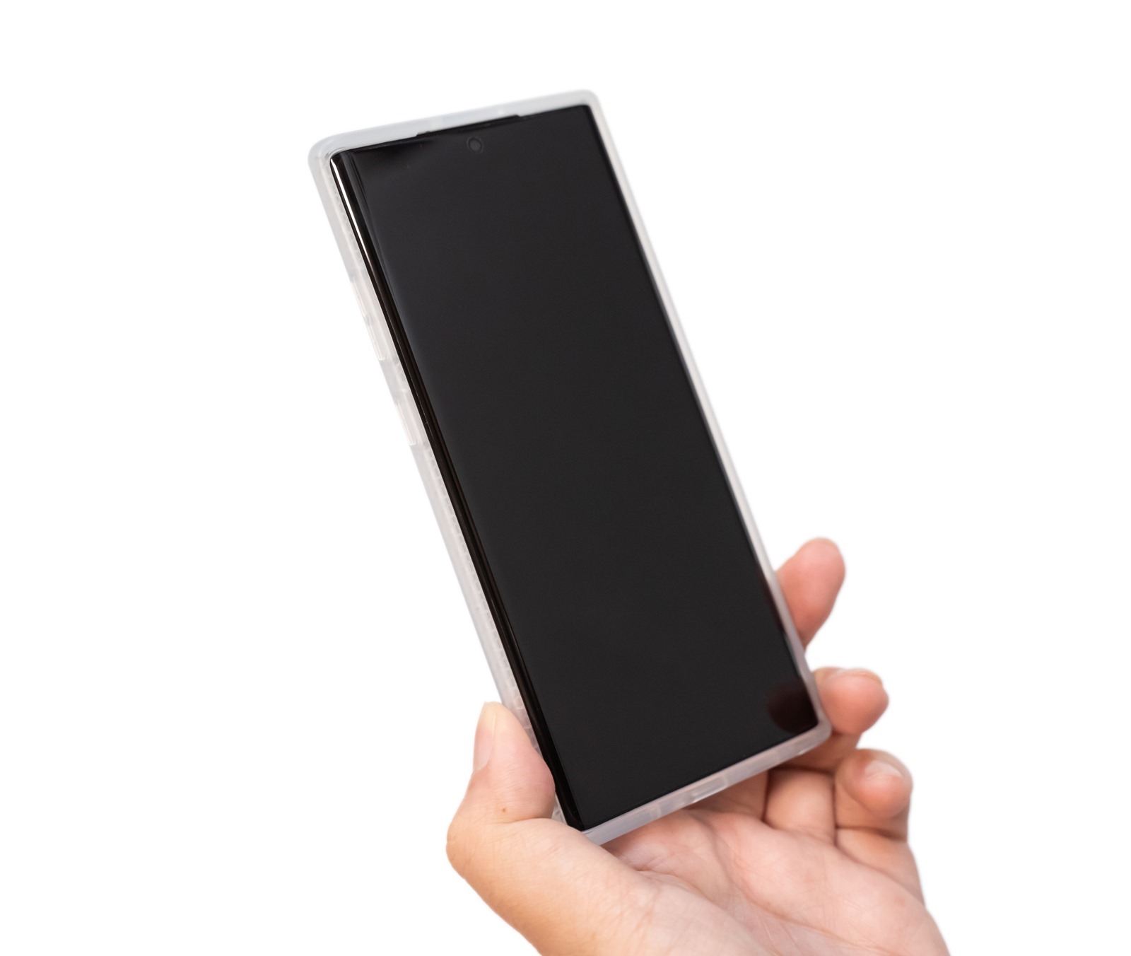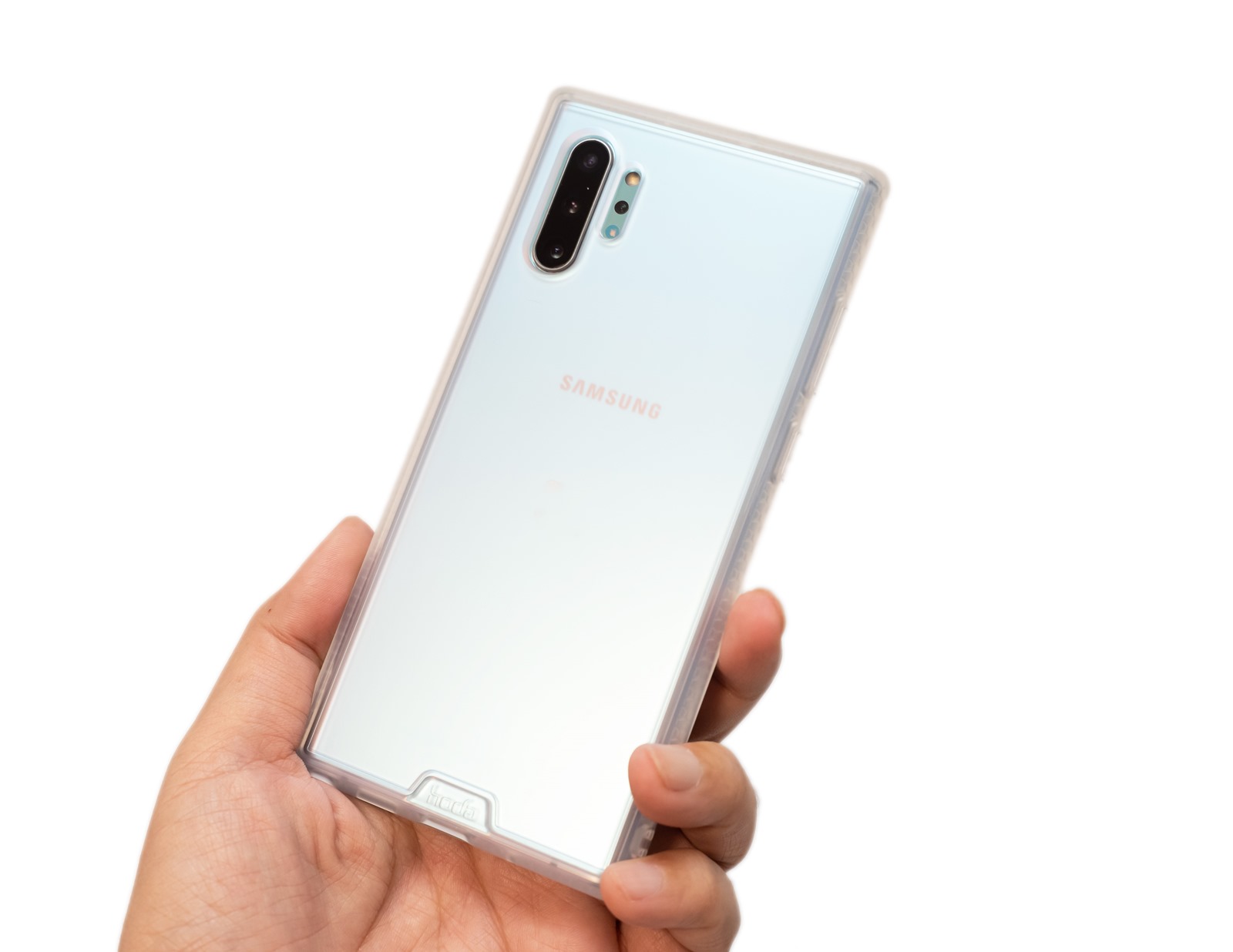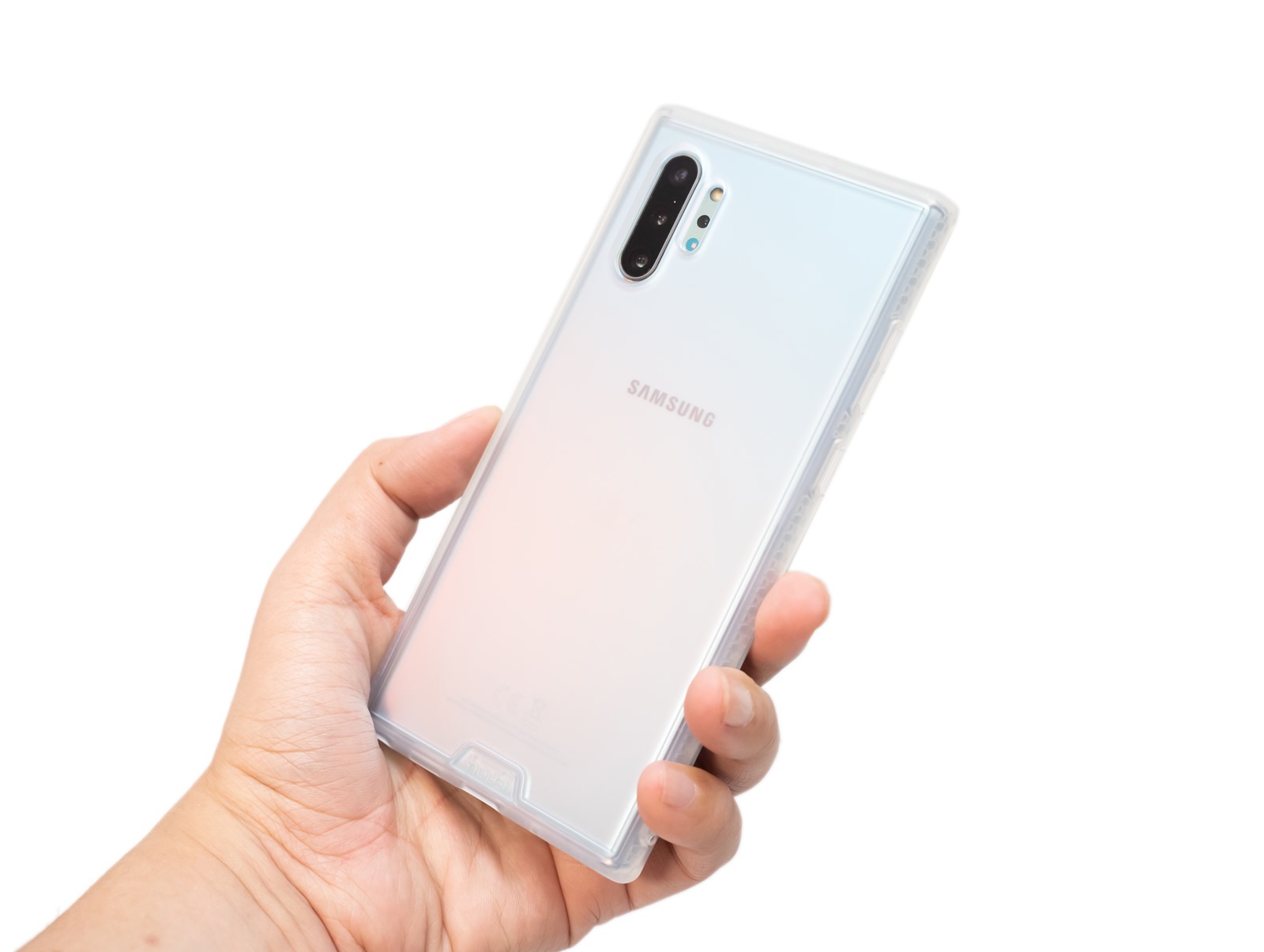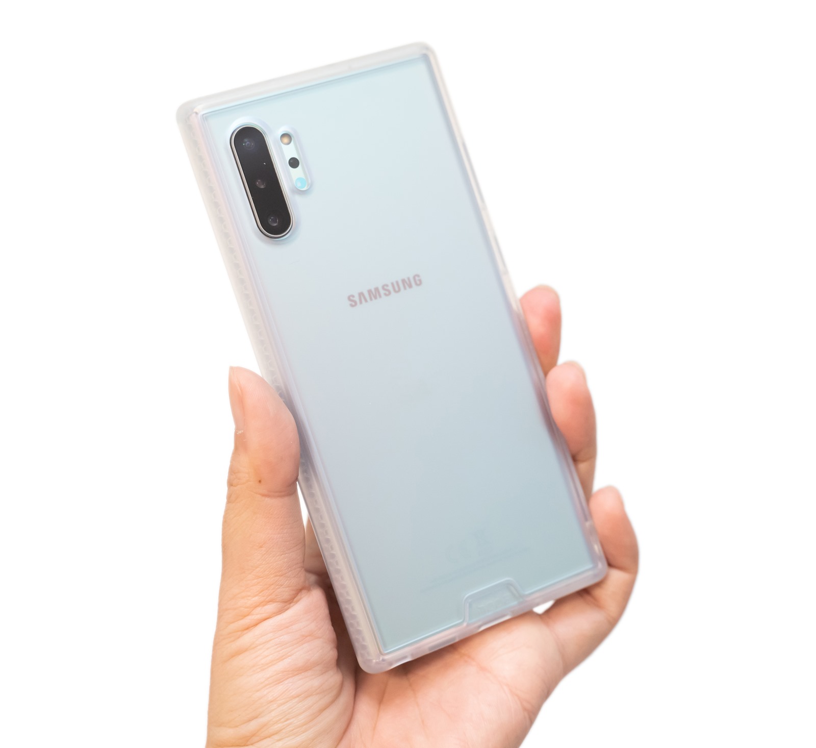 霧透的背蓋設計也可以略為透出手機原本機身的顏色與設計,例如這是 Note10/10+ 銀色機實際裝上的樣子,炫彩的顏色就會隱約顯露出來!保護殼上的 PC 膚感塗佈,滑順抗指紋,使用不留痕跡,摸起來手感又好讓人愛不釋手。