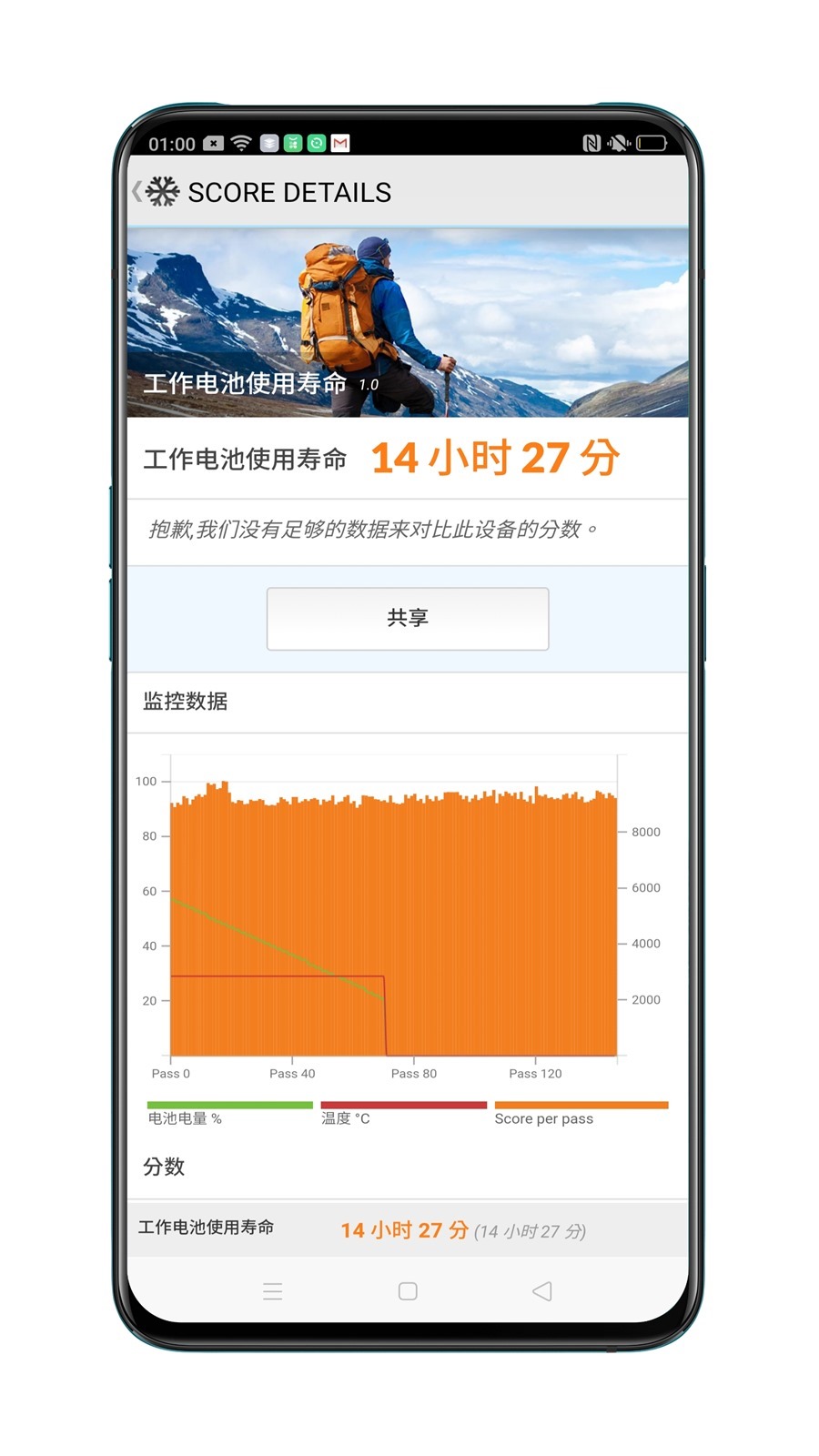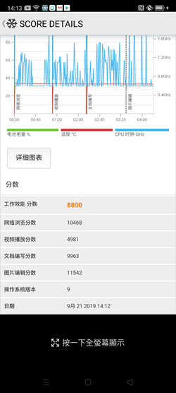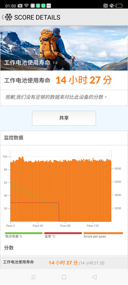 阿輝實際測試 Reno 2 內建電池容量為 4000 mAh,實測電力部分以 PCMARK 做標準測試,測試 80% ~ 20% 間的電力運行,模擬上網、工作、遊戲的混合應用,測試結果為 14 小時 27 分鐘,近期 Oppo Reno 系列的電力表現都十分不錯,今天 Reno 2 的表現也是十分優異,測試方式與標準可以參考這篇說明。