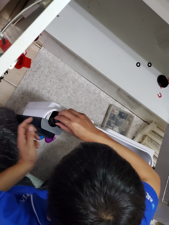 產品看完了,重頭戲差不多要開始了,專業的師傅已經降臨阿輝家,準備要來改善此地的飲用水品質了;第一件事情就是先確認櫥下空間與櫃子尺寸,扁長形的機身不管躺著或是立起來都可以。