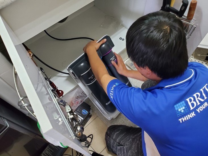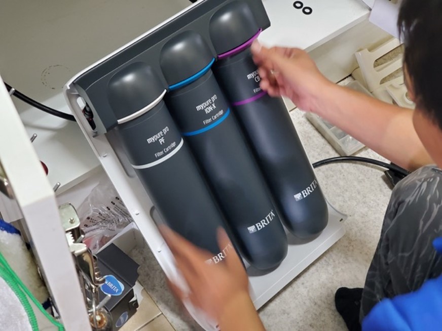 而阿輝找了 BRITA 來解決飲水問題,不只因為來自德國的高品質值得信賴,也因為不需插電就可以得到生飲等級用水持續一整年!而且更換濾芯也不需要任何工具,還有濾芯狀態顯示燈可以顯示更換提醒,裡面是水銀電池能手動重設,並且還派專人到阿輝家安裝。