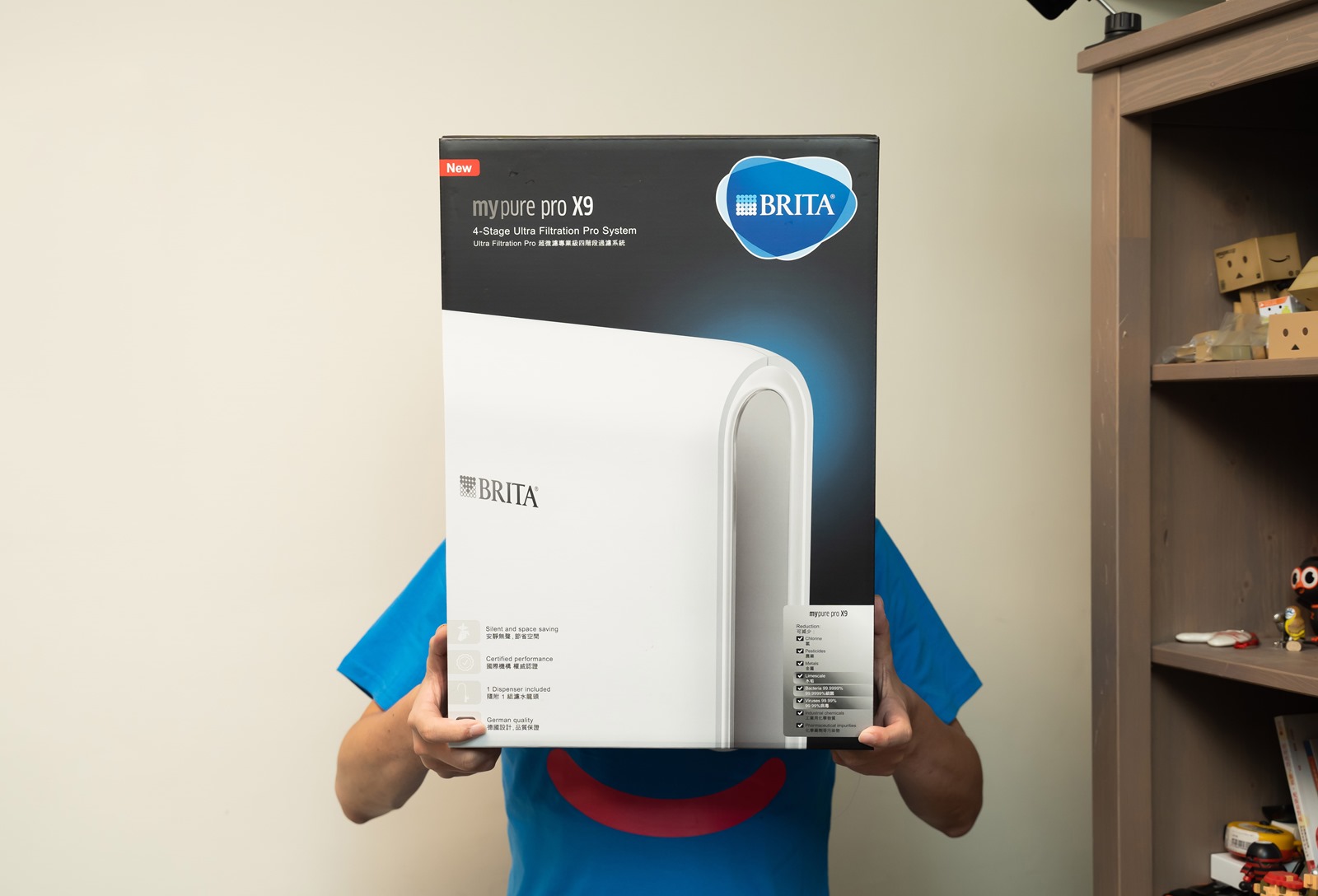 BRITA mypure pro X9 的紙箱可以看到黑底的箱子上有印製 BRITA mypure pro X9 商品外觀照。