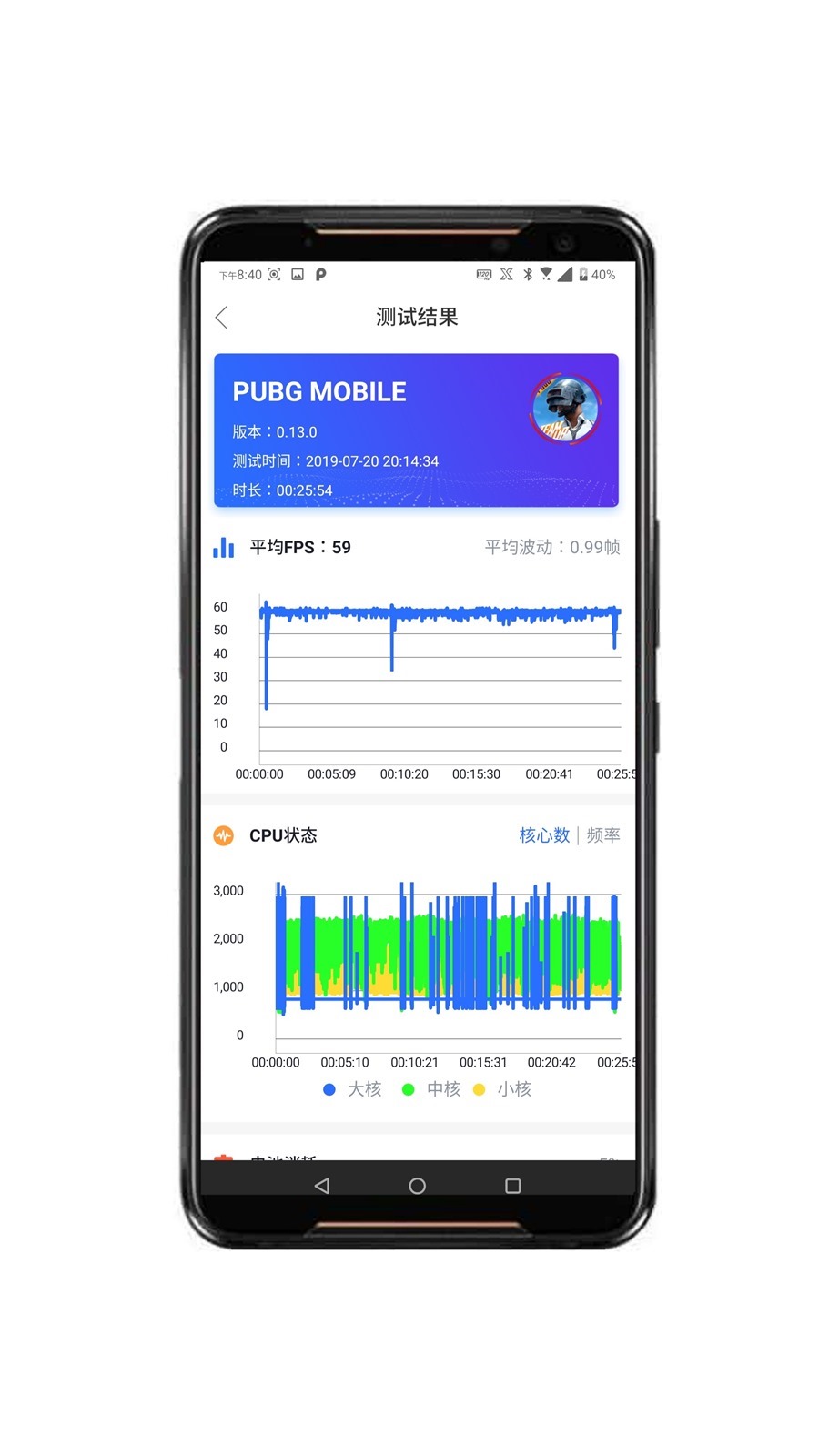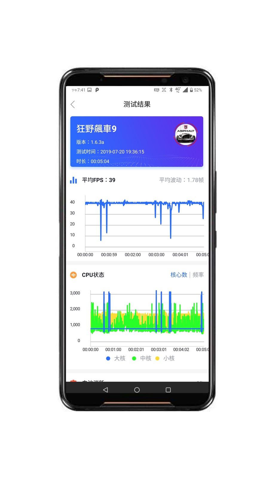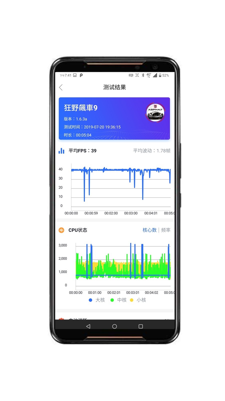 賽車遊戲大作狂野飆車 9 也實測,實際遊玩約 5 分鐘,這裡比較特別發現狂野飆車 9 在一般手機上是鎖定 30 fps 上限,而在 ROG Phone II 上似乎開放到 40fps 上限,KFMark 記錄平均幀數 39fps,波動 1.78 ,看核心數的啟動狀態似乎也是很有後續更新高更新率的機會!