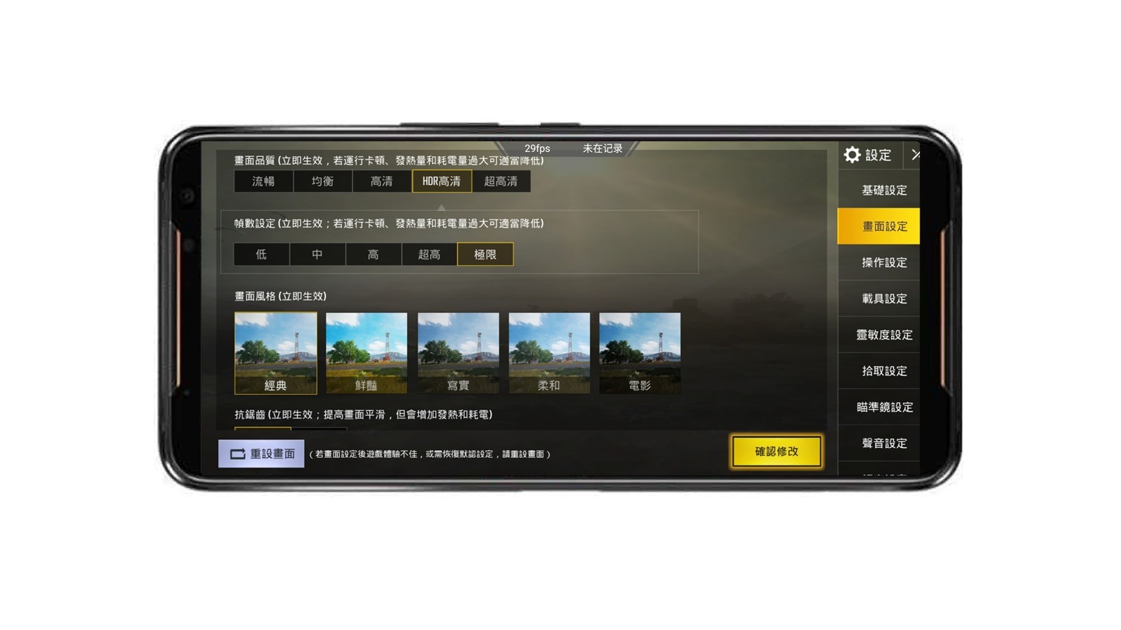 這一次 ROG Phone II 也是跟 PUBG Mobile 聯名合作上市,強強聯手,當然重點就是 ROG Phone II 的高規格與針對遊戲的設計非常適合玩這重度效能需求的遊戲,因此國際版的 PUBG Mobile 阿輝實際測試可以 ROG Phone II 上已經可以開啟 60fps 的模式選項,之前阿輝測試 S855 機種僅能開啟 40fps,60fps 需要手動用工具程式修改開啟,ROG Phone II 不須手動修改直接就是最高性能等級!