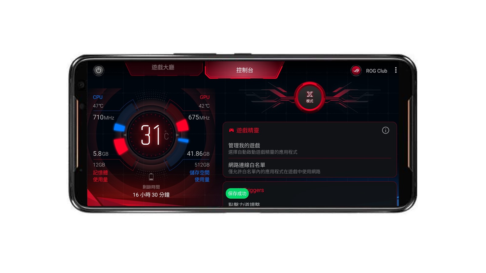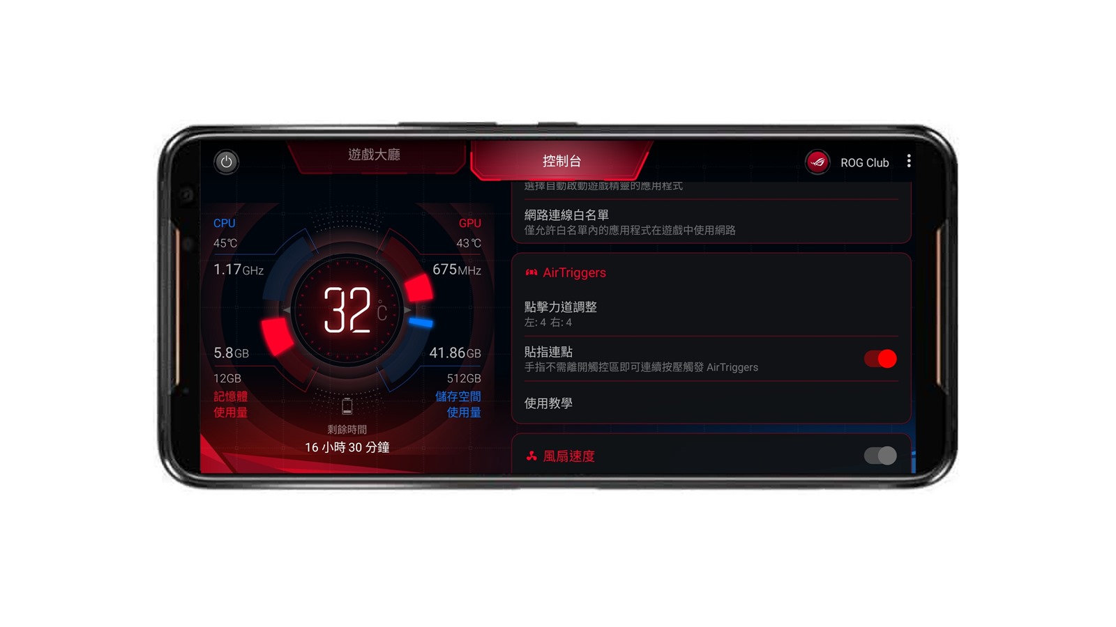 ROG Phone II 內建的 Armoury Crate 控制介面,包含了 CPU 、 GPU 、記憶體、儲存空間與溫度等資訊顯示,遊戲模式與周邊的相關設定也會籍中在此處方便用戶查詢與設定。