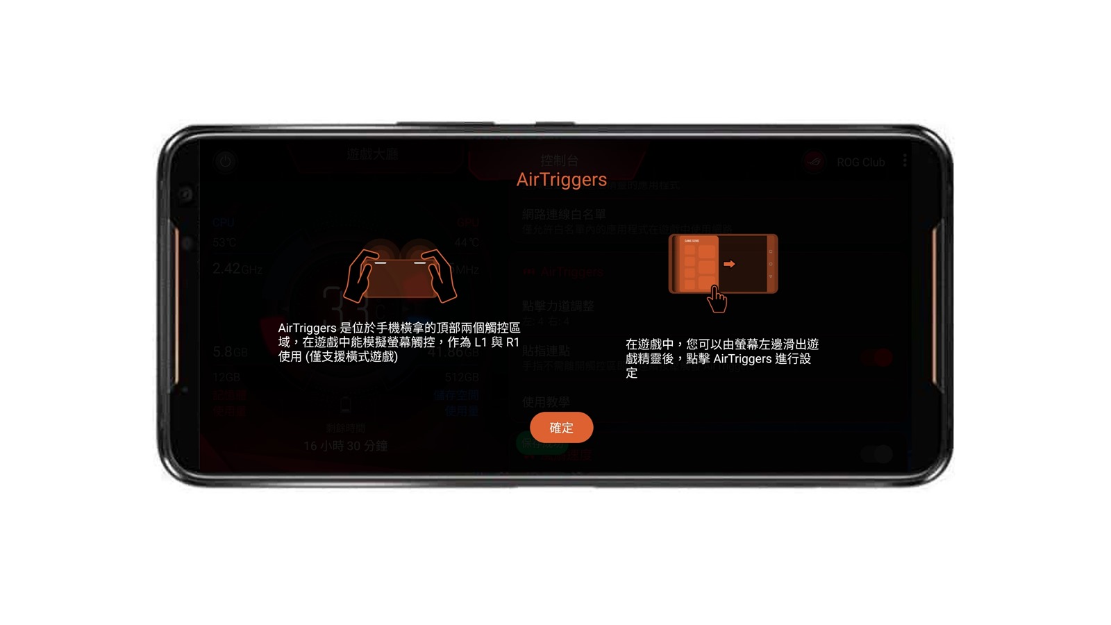 特別要說的是 ROG Phone 自豪且受歡迎的 AirTrigger 感應按鍵自然依舊繼承甚至更進化到了 AirTrigger II,作用範圍更大感應速度更快速,AirTrigger II 利用超音波感應器偵測用戶的觸碰動作,按下時還會以震動回饋給用戶,按下僅需要 20ms 的超快速度就可以回應,震動回饋的感覺也更接近實體按鈕的使用感受;AirTrigger II 可以配合遊戲中心功能指定為遊戲中的任何功能延伸按鈕,如同遊樂器手把的 L1/R1 按鈕,要一鍵開鏡或是快速開背包都是容易達成的事情。