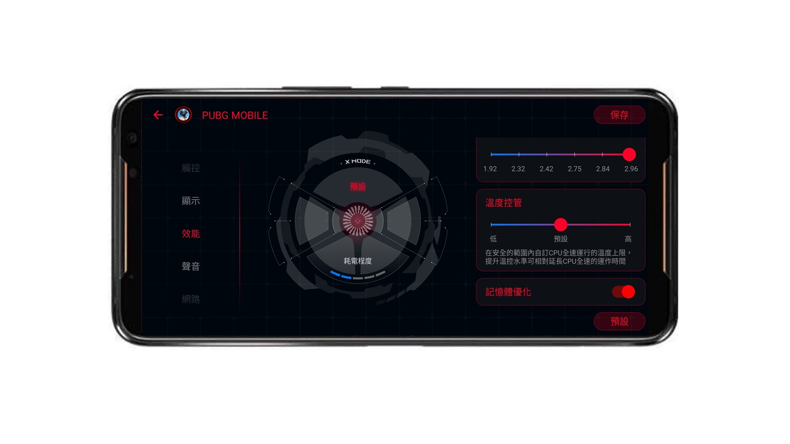 針對遊戲的效能設定,CPU 時脈與溫度控制都可以設定,也可以開啟記憶體最佳化的功能可以![]()