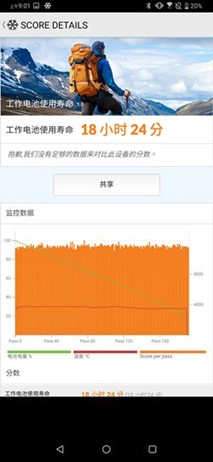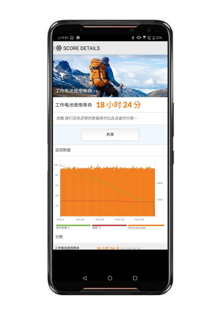 阿輝實際測試 ROG Phone II 內建電池容量為 6000 mAh,實測電力部分以 PCMARK 做標準測試,測試 80% ~ 20% 間的電力運行,模擬上網、工作、遊戲的混合應用,測試結果為 18 小時 24 分鐘,測試方式與標準可以參考這篇說明。