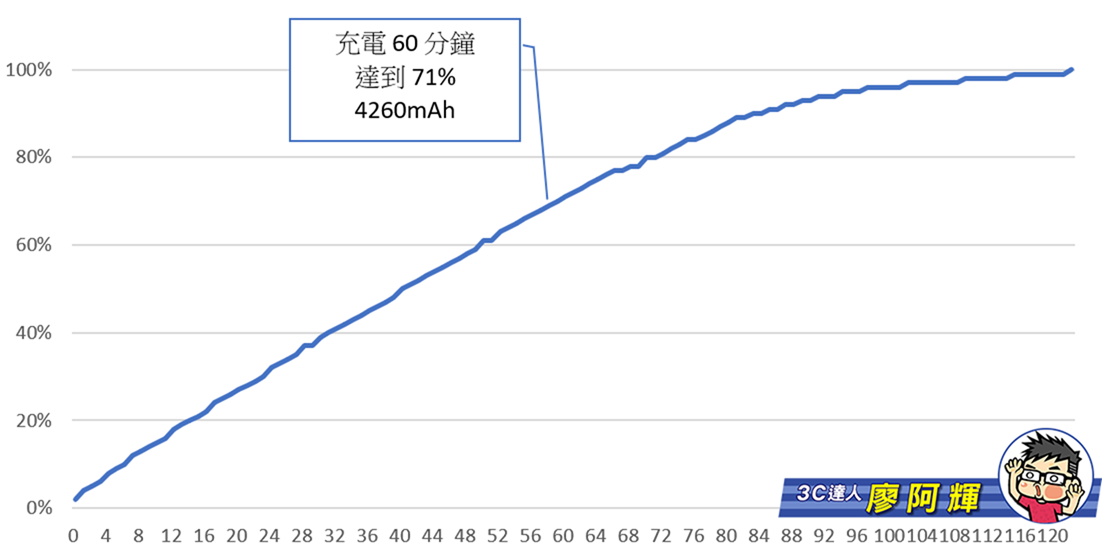 充電部分 ROG Phone II 也繼續沿用 30W 的 HyperCharge 快充,並且也相容 QC3.0 與 PD3.0 快速充電技術,阿輝這裡也實際充電測試記錄,大約一小時就可以充電到 4260mAh 的電量 (60%),而全部充滿 6000mAh 也僅需要約 120 分鐘。