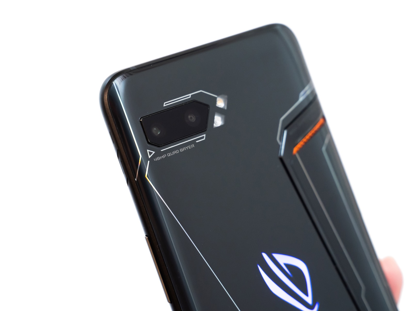 ROG Phone II 也搭配了雙相機模組,主相機是與 ZenFone 6 一樣評價很高的 4800 萬像素 Sony IMX586 感光元件配合 f/1.79 大光圈的組合,支援四合一像素合併技術/超級夜景等拍攝能力,第二鏡頭則是搭配實用的 1300 萬像素超廣角 125 度鏡頭的組合,雙鏡頭模組旁邊還有用於拍攝與配件搭配都會使用到的補光燈(閃光燈)。