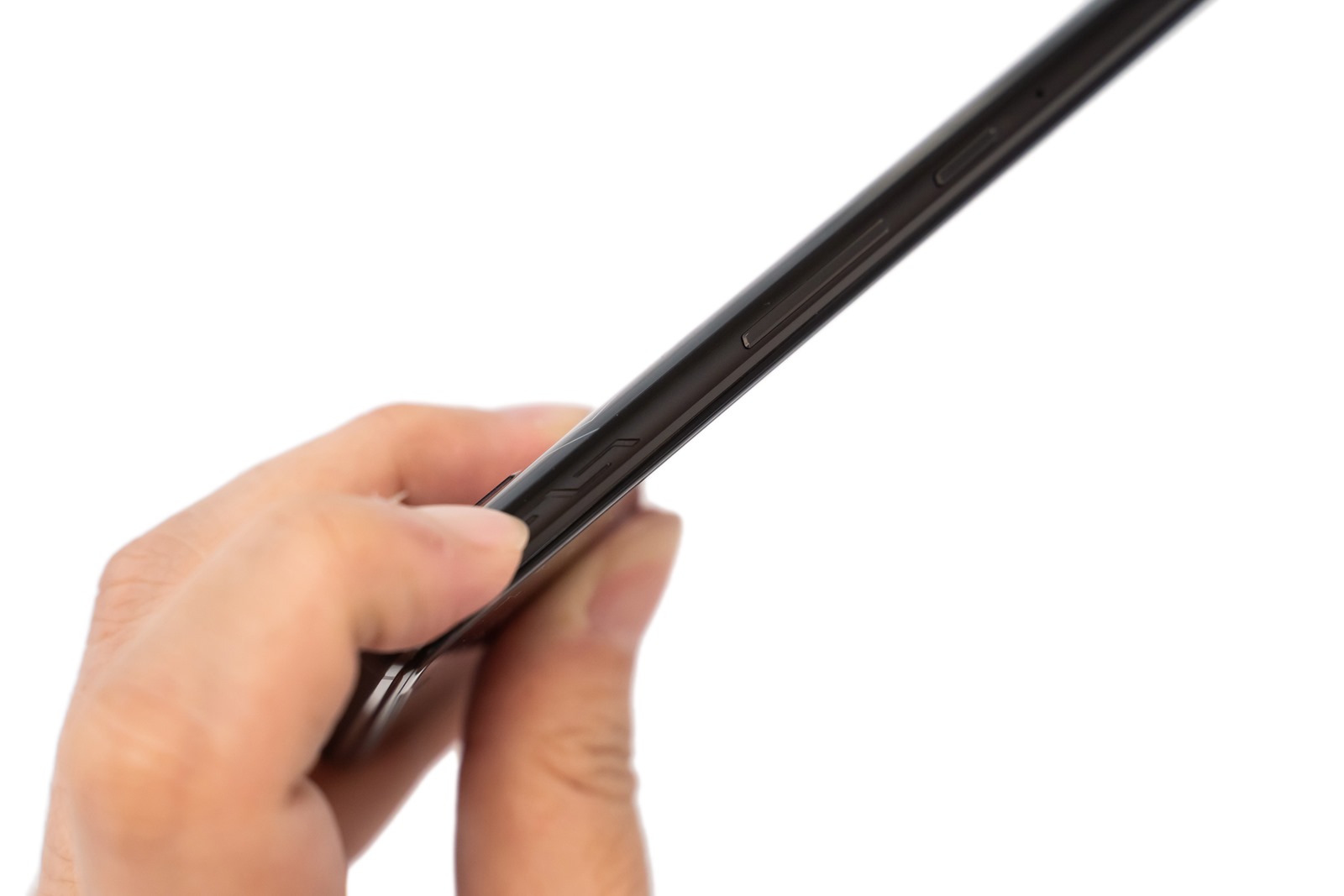 採用了 6.59 吋大螢幕的 ROG Phone II 為了讓用戶也一樣有最好的手感,在外型設計上也下足了功夫,採用了 3D 曲面玻璃作為機身,金屬邊框也採用鑽石切邊處理,金屬與玻璃的組合精密圓潤,握持手感非常舒適。