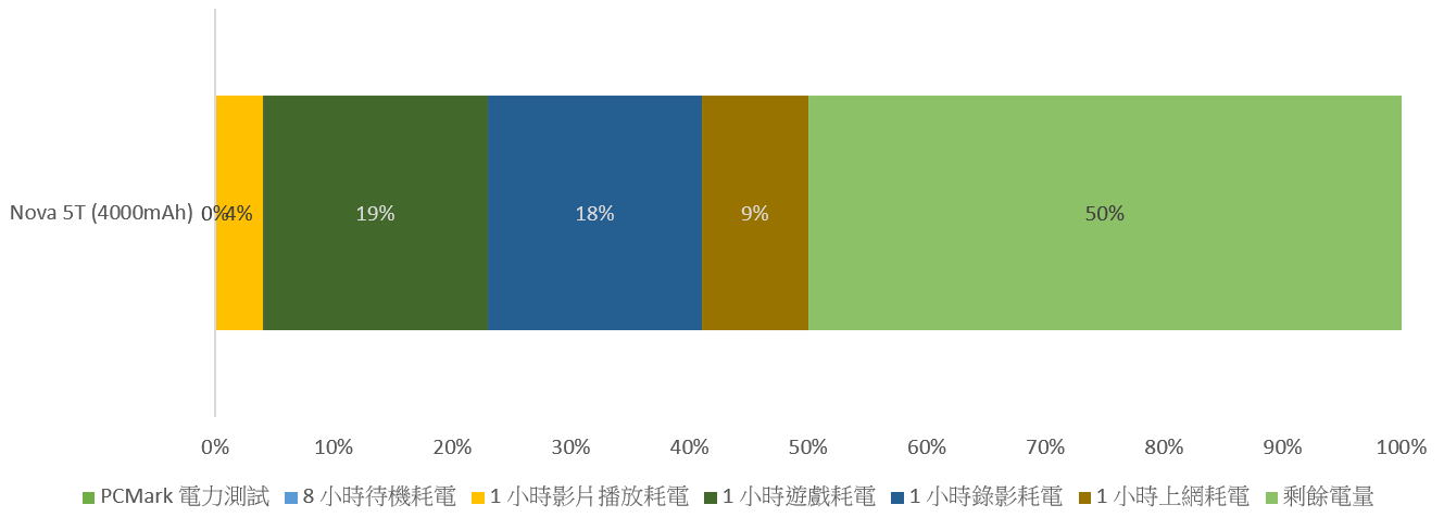 - Nova 5T 手機待機 8 小時測試,實測消耗 0% 電量,剩餘 100%