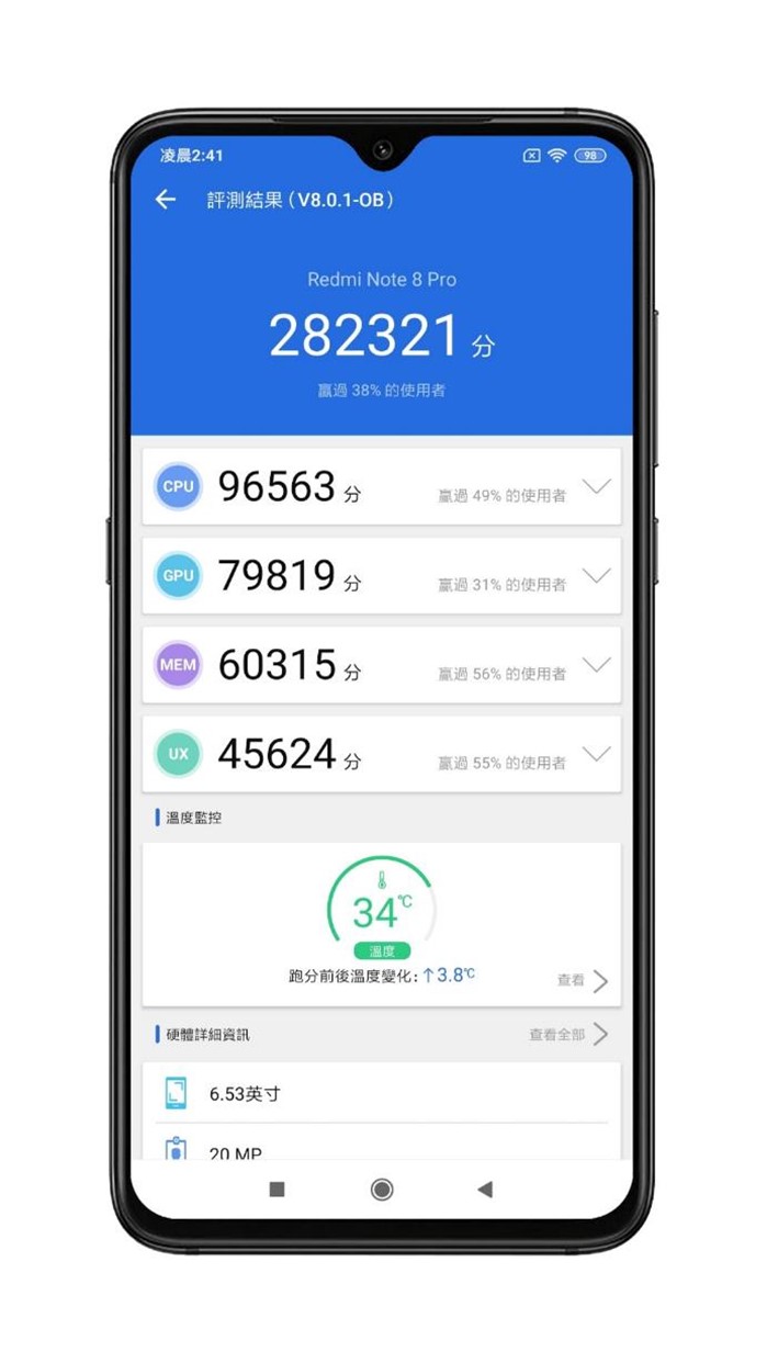 Redmi Note 8 Pro 採用 MTK G90T 處理器與 6GB 內建記憶體的規格配置,更多資料也可以阿輝資料庫 https://reurl.cc/MxdjK ,資料庫中包含超過 200 支以上以上阿輝多年測試的實測數據,可以給大家作為對照參考使用。