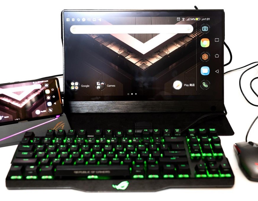 重點的側面 Dispay Port 與 MicroUSB 3.0 接口為提供與桌上型電腦連接使用,接上後再將螢幕接到桌上型遊戲基座上,就可以隨時透過桌上型遊戲基座前方切換按鈕,直接快速切換電腦與 ROG Phone II 的交換使用情境,也許也可以說桌上型遊戲基座是一個針對 ROG Phone II 與桌上型電腦專門打造的 KVM(鍵盤影音切換管理設備)