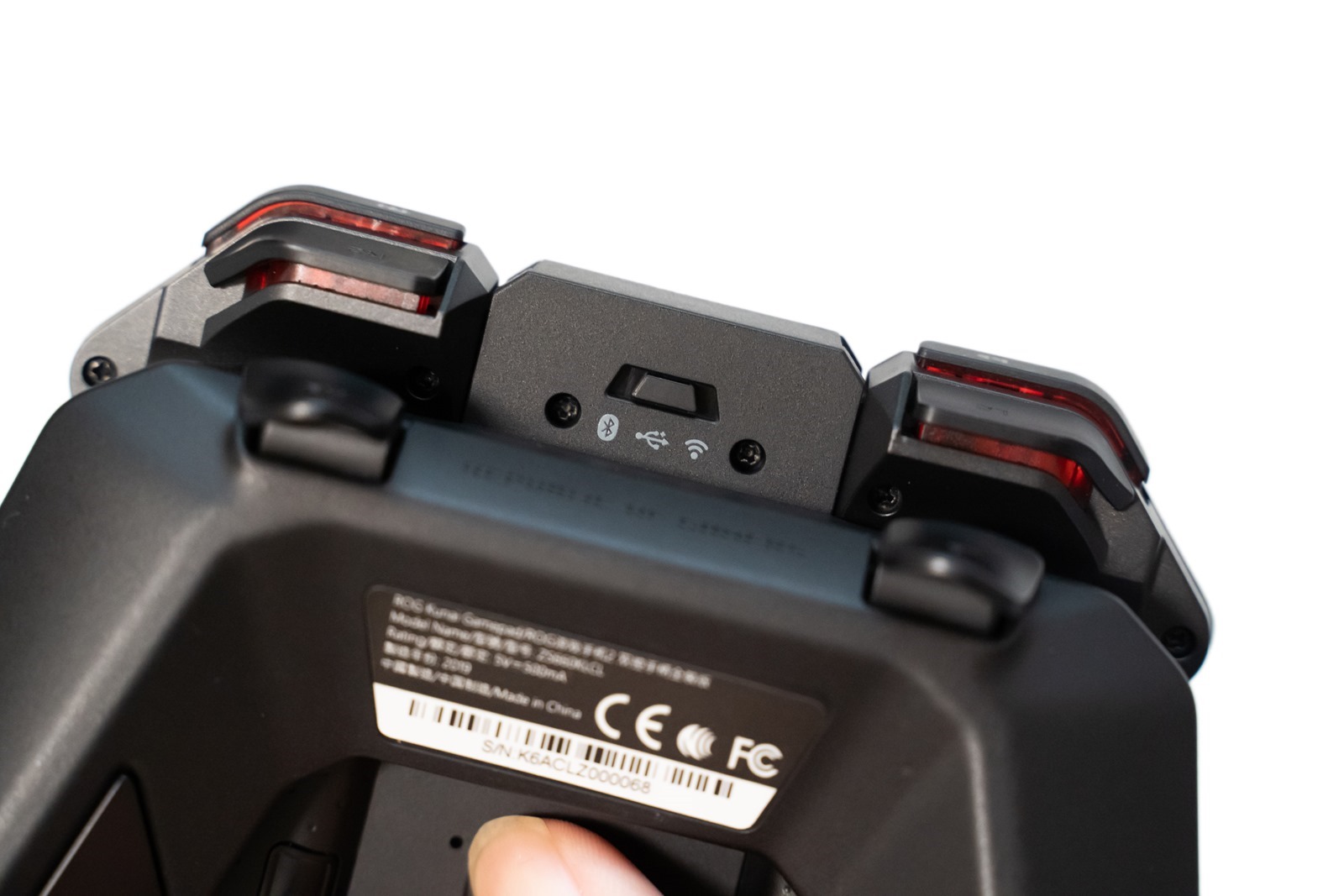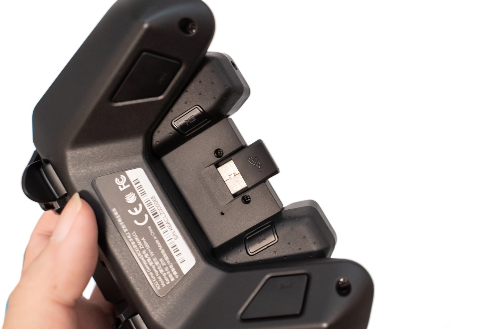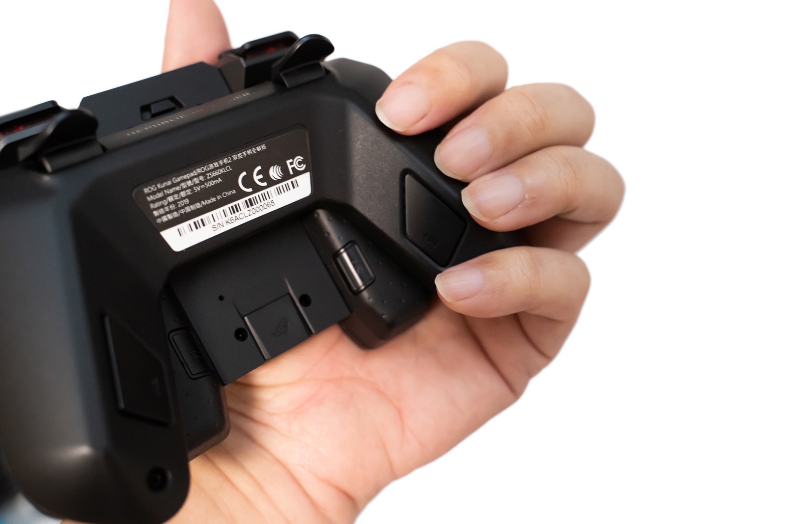 手把本體中也藏有 2.4G USB 介面的接收器,可以配合兩種遊戲基座使用,甚至除了 ROG Phone II,其實 ROG Kunai GamePad 連接電腦也是一樣可以使用了,這配合後面我們會介紹到的桌上型遊戲基座就是一個很好的應用組合方式!