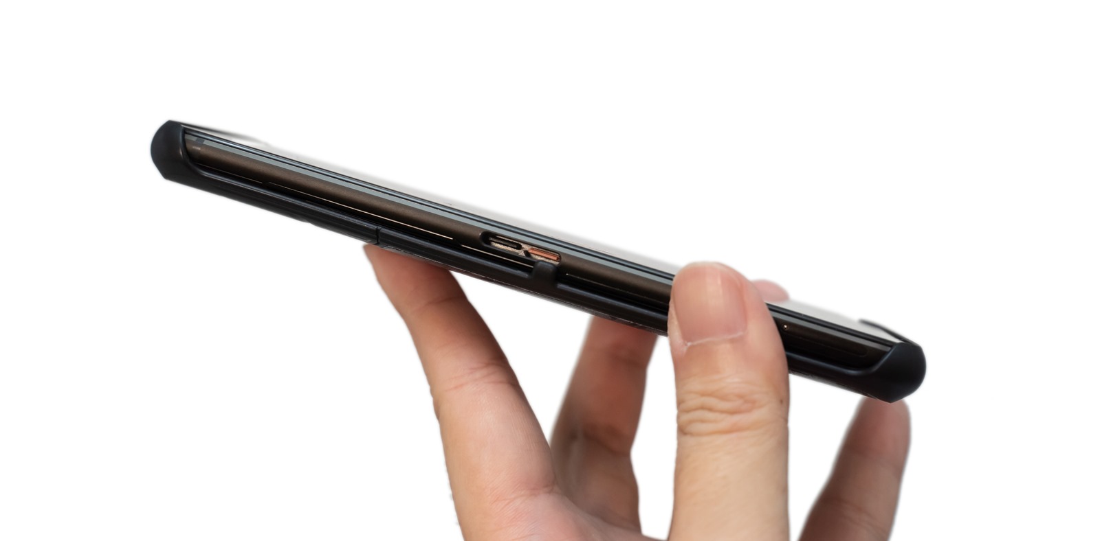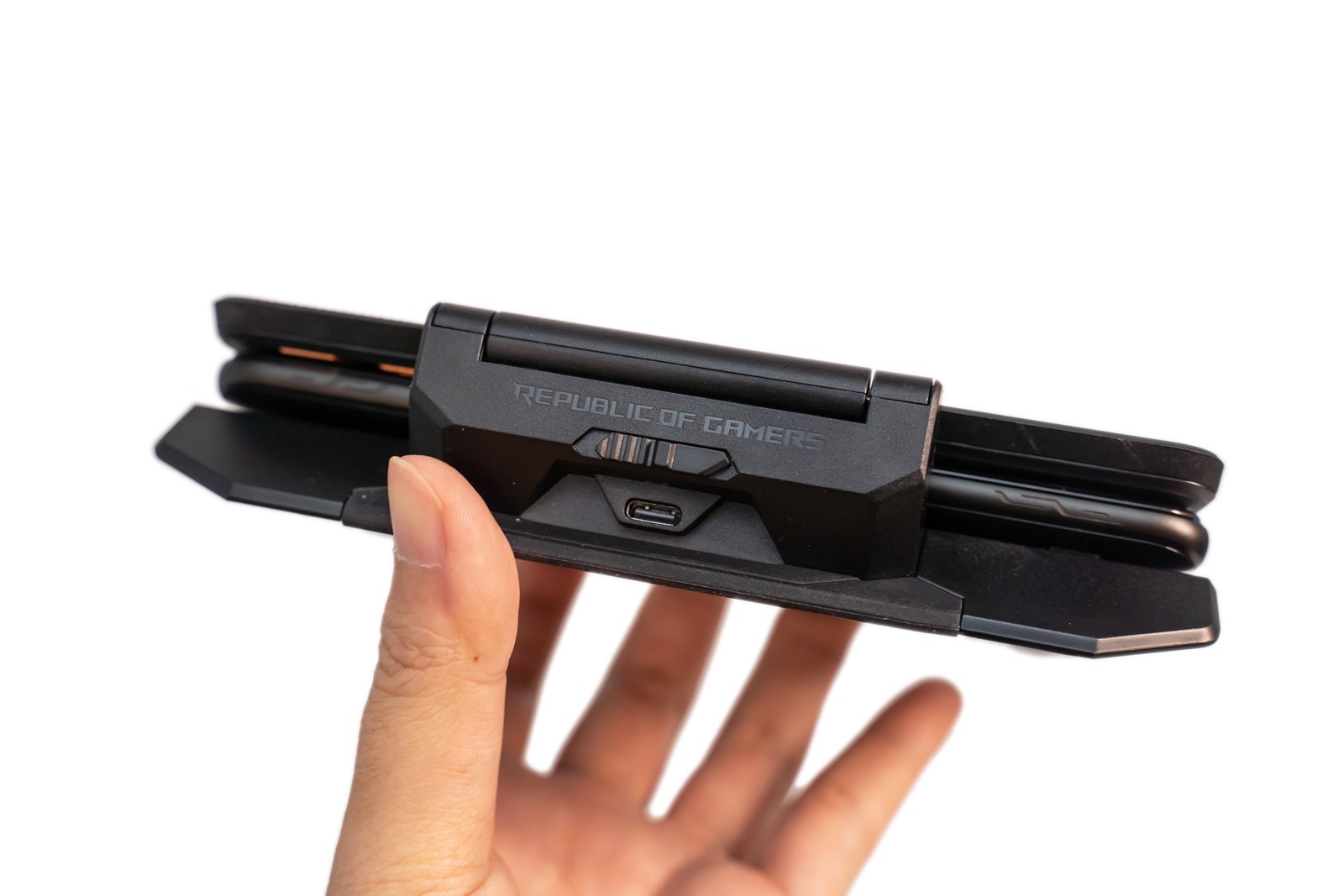 頂部也有安全鎖的設計,讓 ROG Phone II 裝入後不會輕易的脫開,機器頂部也有 USB C 連接埠於其中