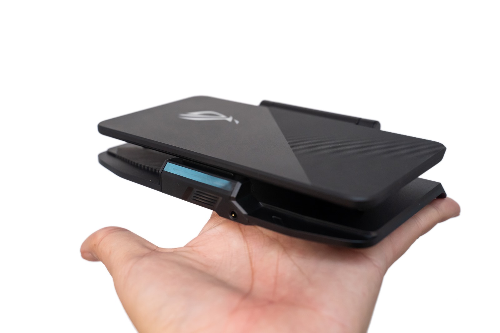 底部也有 3.5mm 耳機孔可以使用;TwinView Dock II 在手機底部還有風扇與風道可以加強手機組合時的散熱效果,同時 TwinView Dock II 本身也內建了 5000mAh 容量的電池,可以在與 ROG Phone II 組合時提供電力的輔助