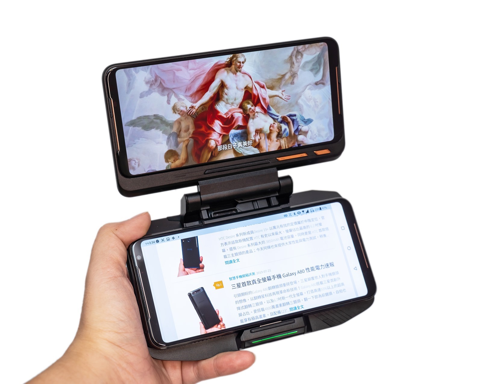 別忘了 ROG Phone II 最讚的完整配件組合啊!當然是 TwinView Dock II 雙螢幕基座可以和 ROG GamePad 遊戲控制器一起組合使用,就像是變形金剛大合體一樣!