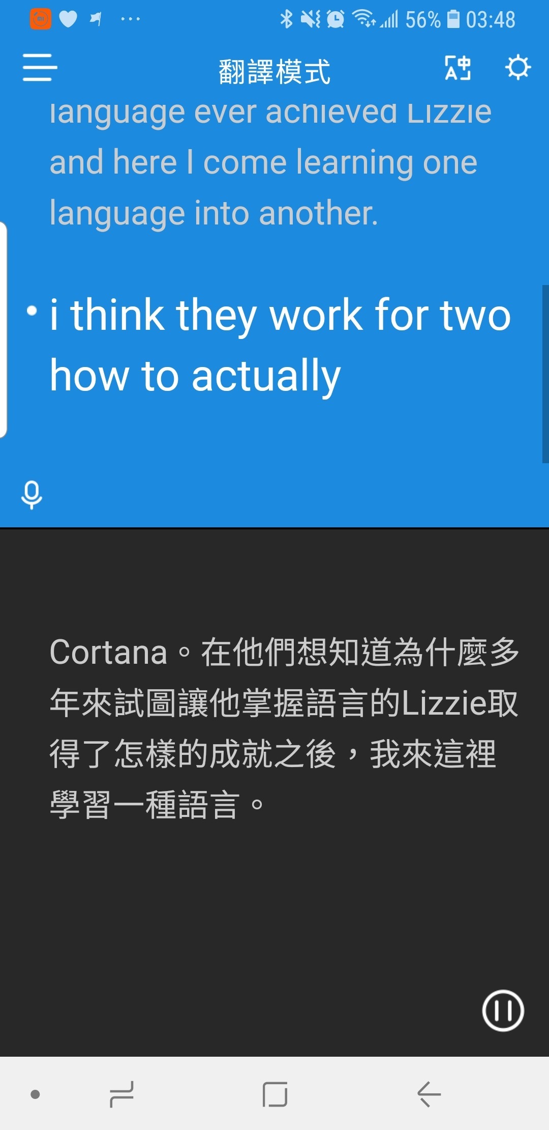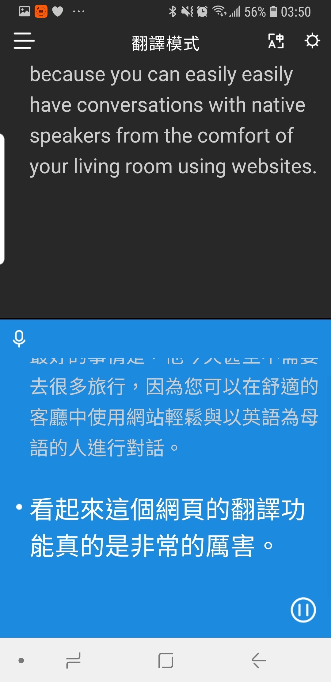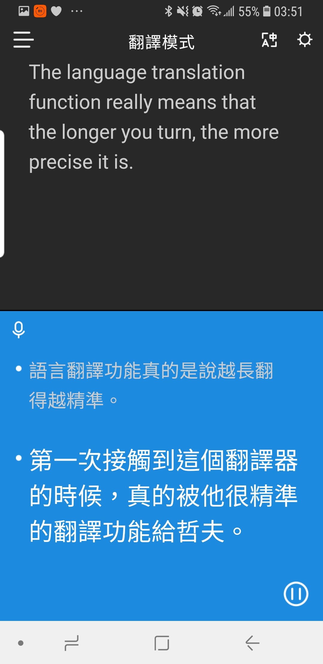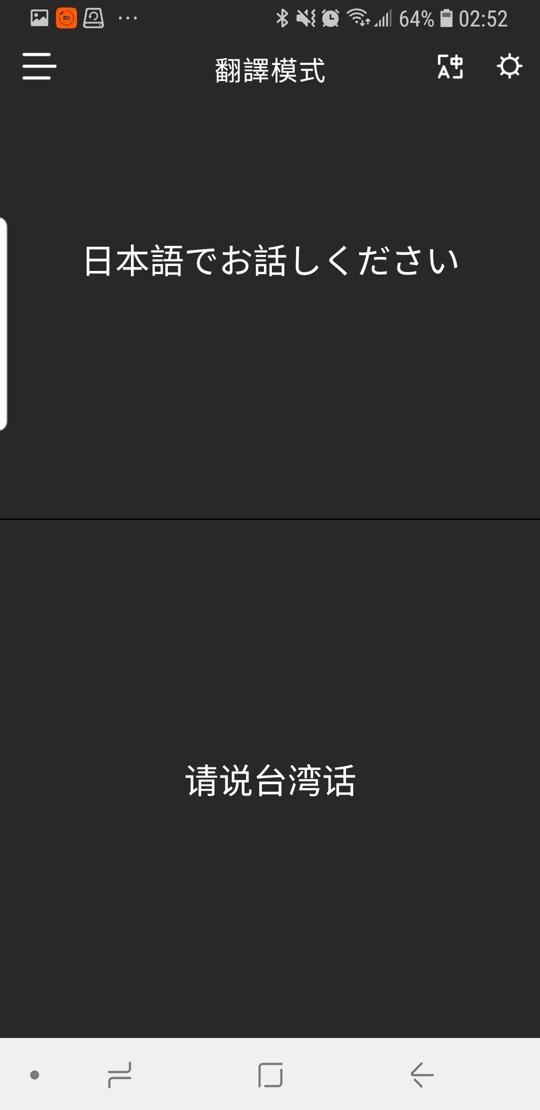 在使用上,當你或者是對方正在說話的時候,相對應的格子就會變成藍色的狀態,代表他正在偵測對話內容。偵測完成之後他就會進行翻譯,同時間使用語音方式說出翻譯後的內容。