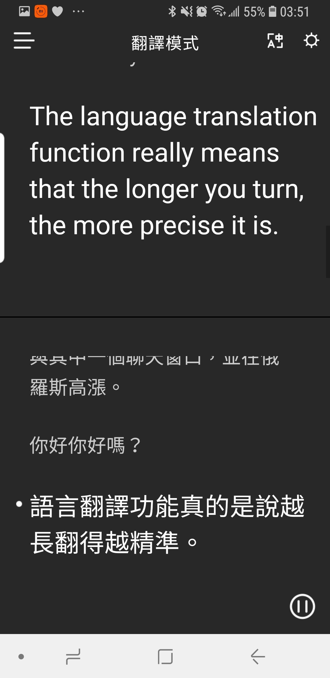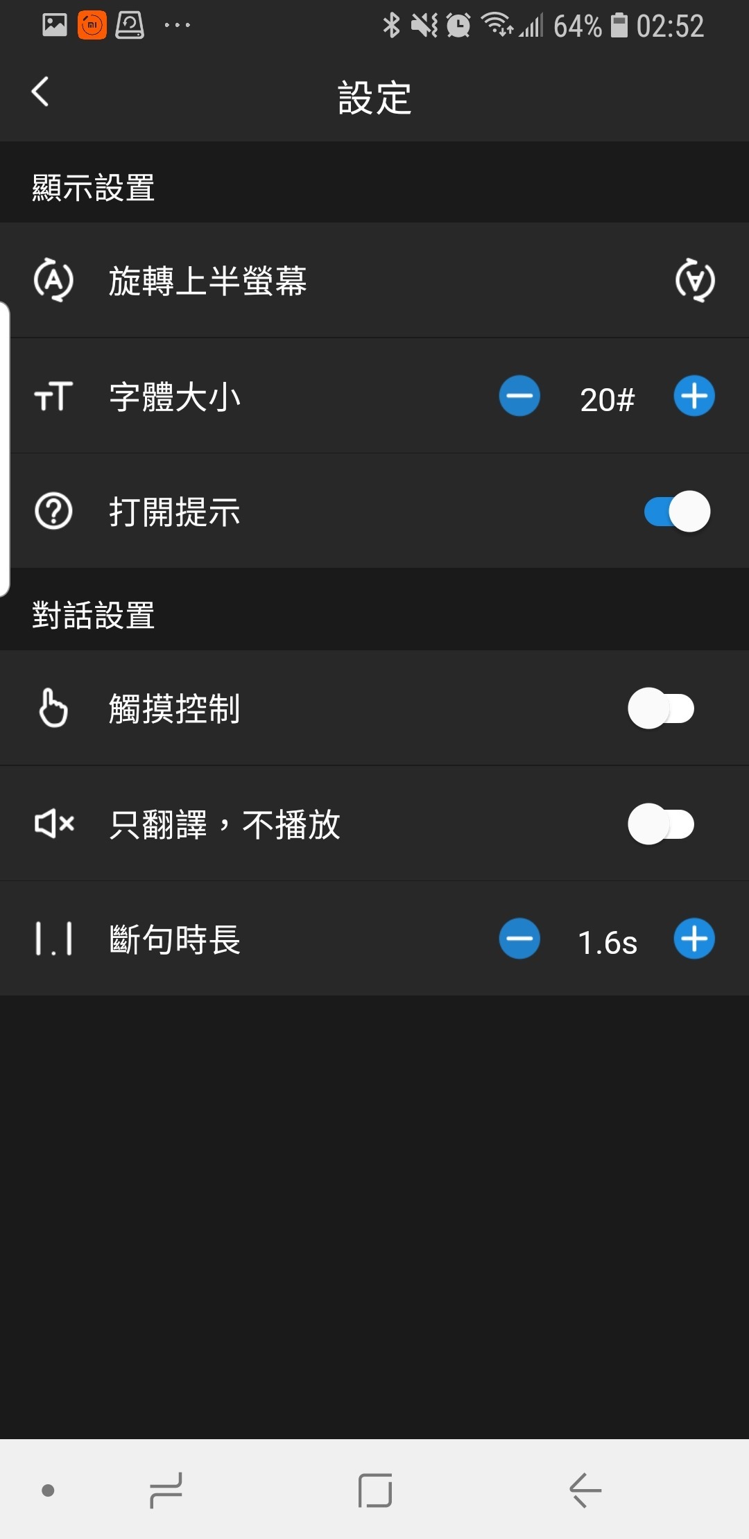 在翻譯模式的設定中,你可以選擇一些特殊的功能,比如像是只翻譯、不播放語音,另外還有就是,原本手機上半部的螢幕是要給對方觀看你說話內容的翻譯結果,所以預設文字都是反過來的,你也可以在這邊選擇把他轉向回來。