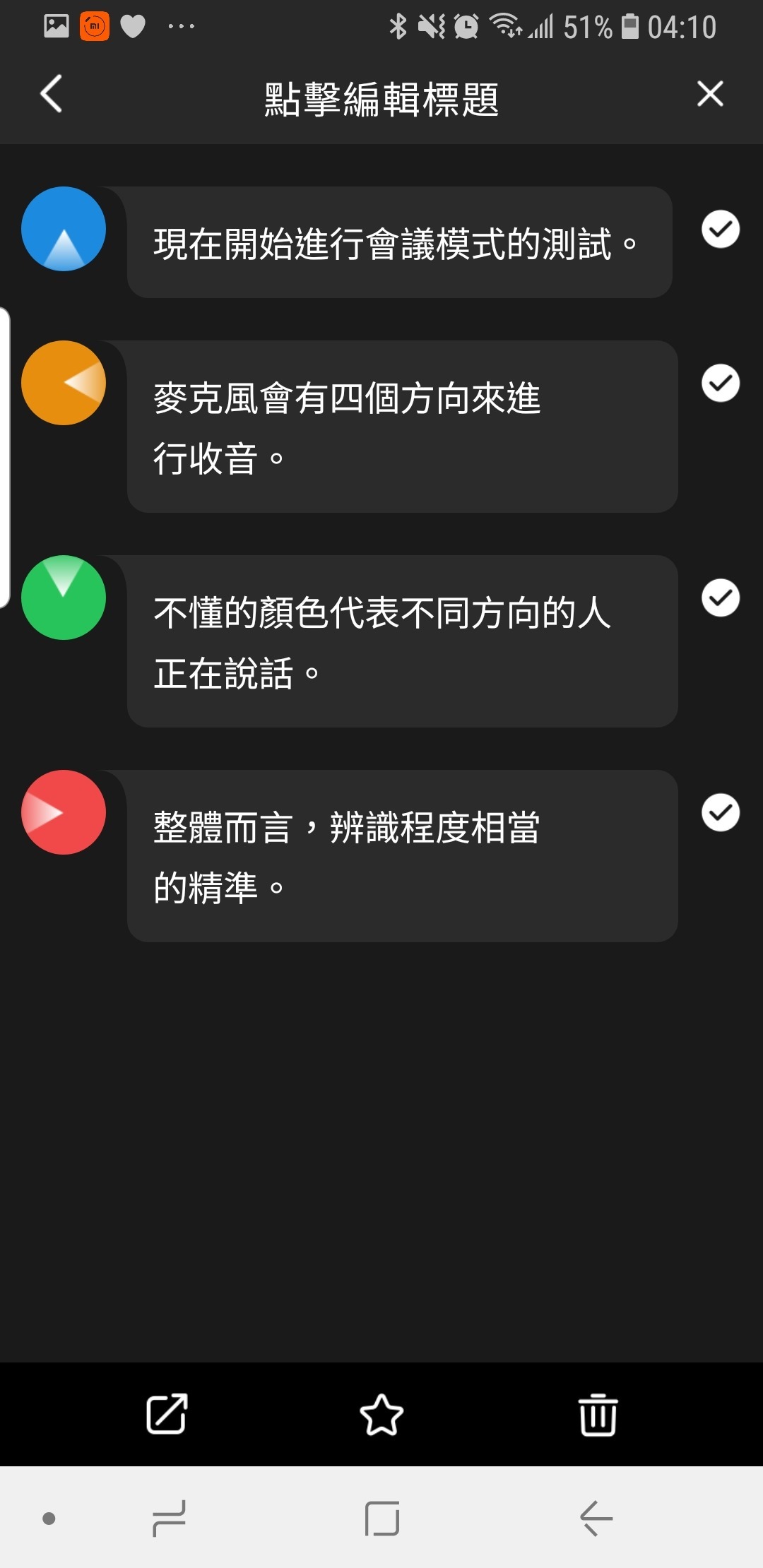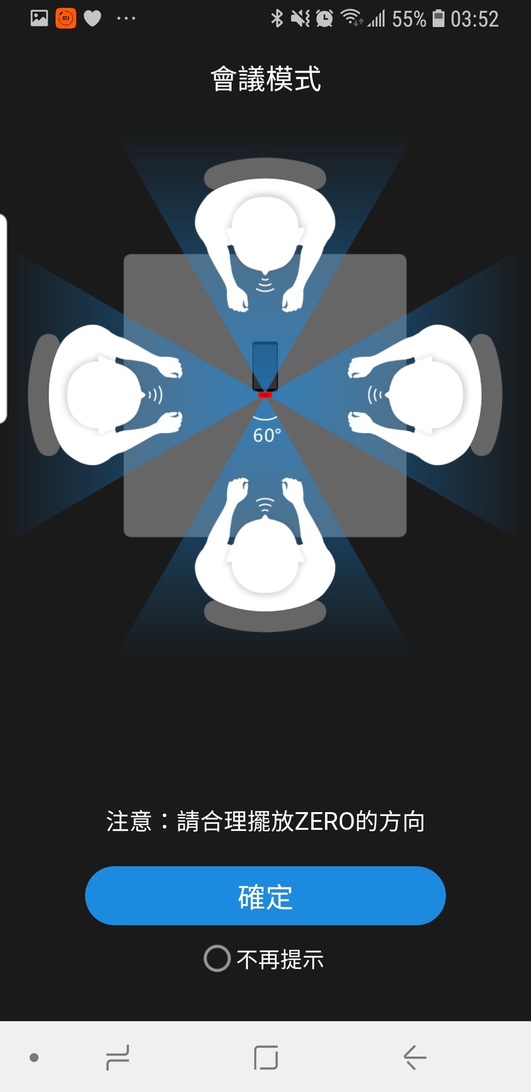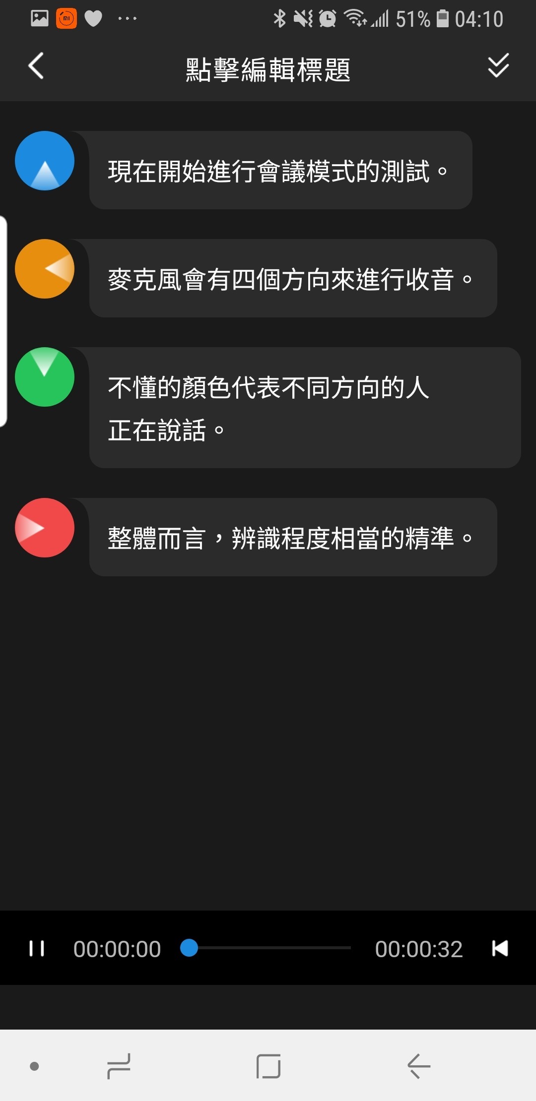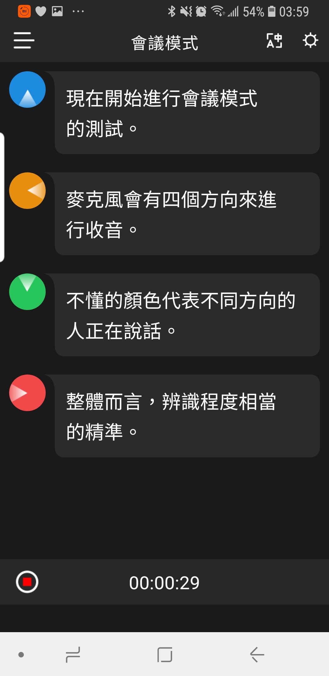 在會議模式中,由於支援四方向的收音,所以在左邊的指標上會有四種顏色,方便你判斷這句話是誰說的。