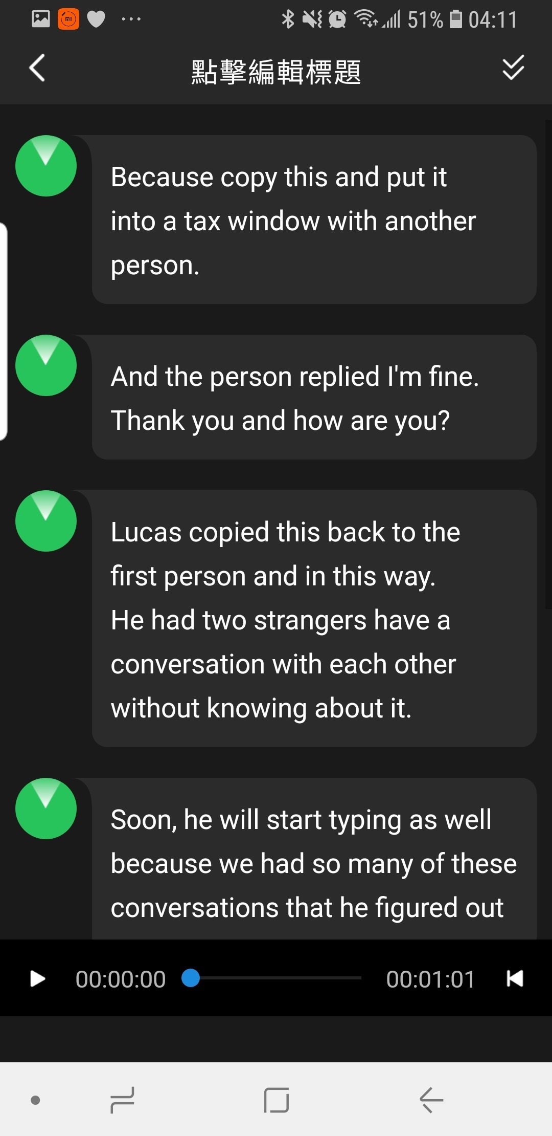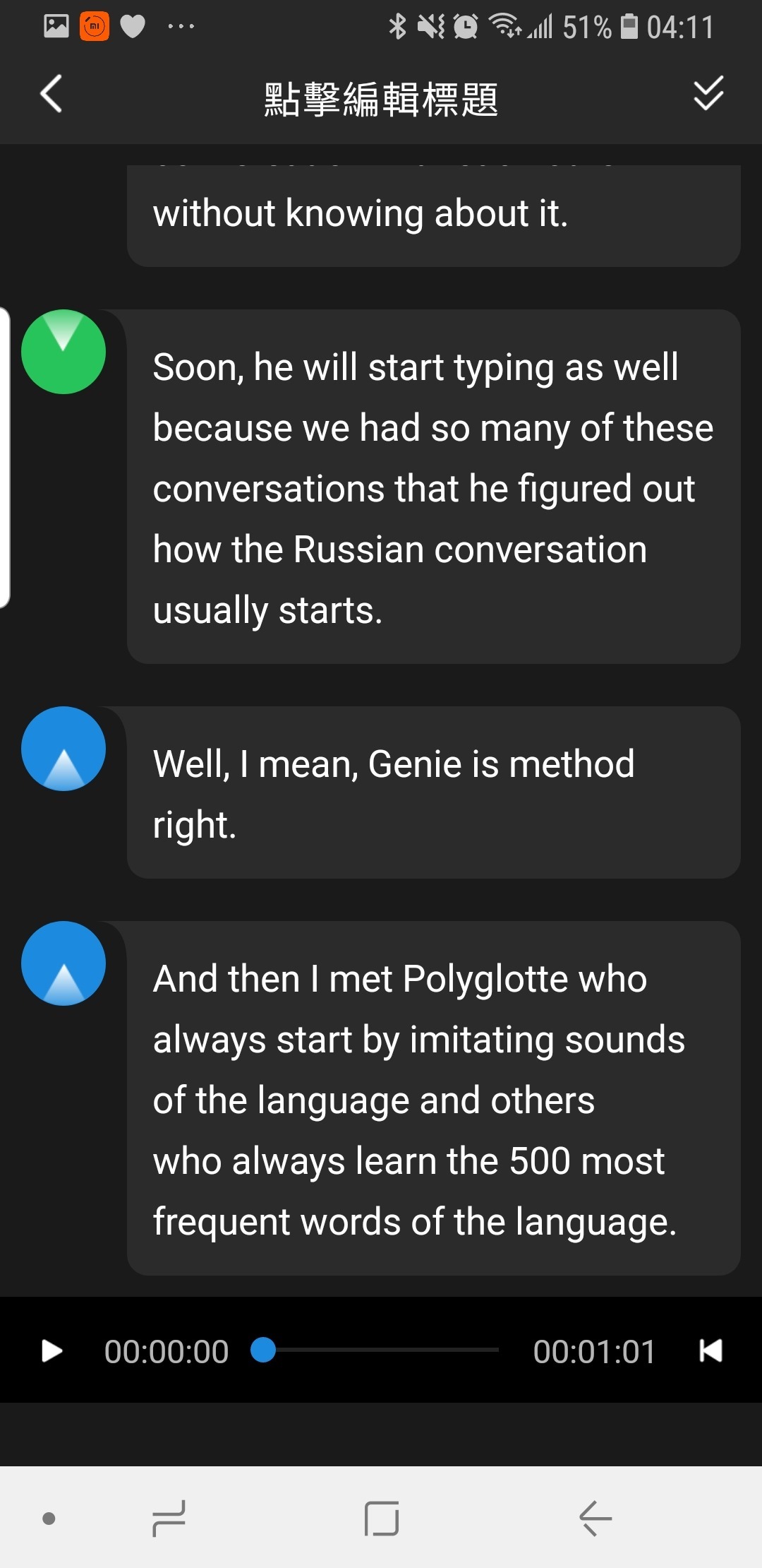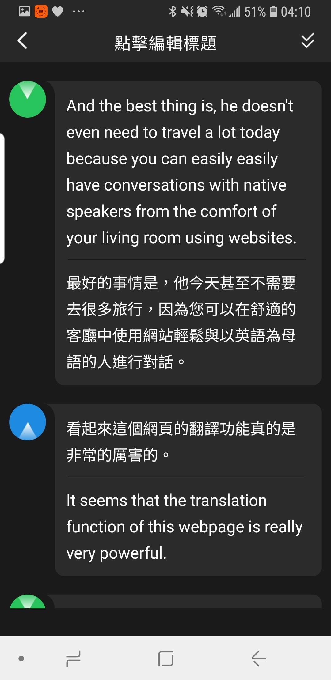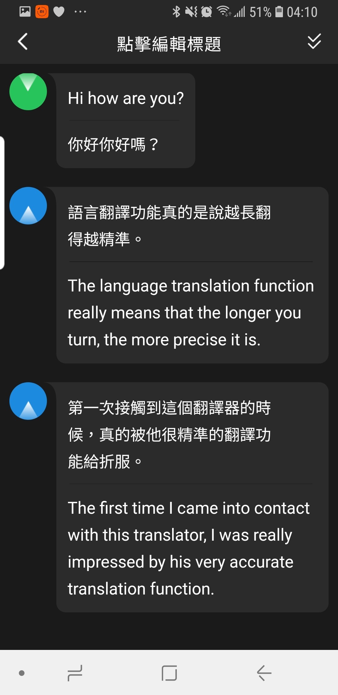 在翻譯模式中,他主要是把雙方對話的內容以直接雙語系翻譯的方式來進行呈現,這樣子很方便一目了然的閱讀。而且左邊還可以透過不同顏色的箭頭色標,來判斷這句話是哪個人說的。