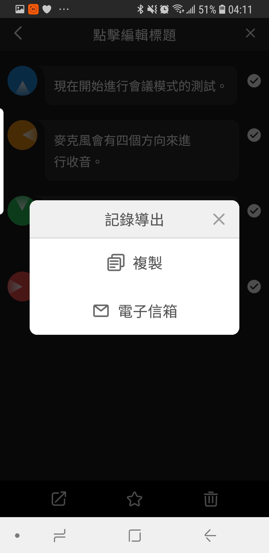 如果想要導出會議模式的內容,只需要點選右上角的箭頭,接著勾選你要輸出的對話,最後點選左下角的分享按鈕,就可以選擇用電子郵件輸出,或是直接將文字複製起來。說實話,這點是真的不方便而且也不直覺,但是原廠表示,全部輸出的功能,包含錄音輸出的功能,都會在未來的正式版本中導入,我們就耐心期帶著吧。