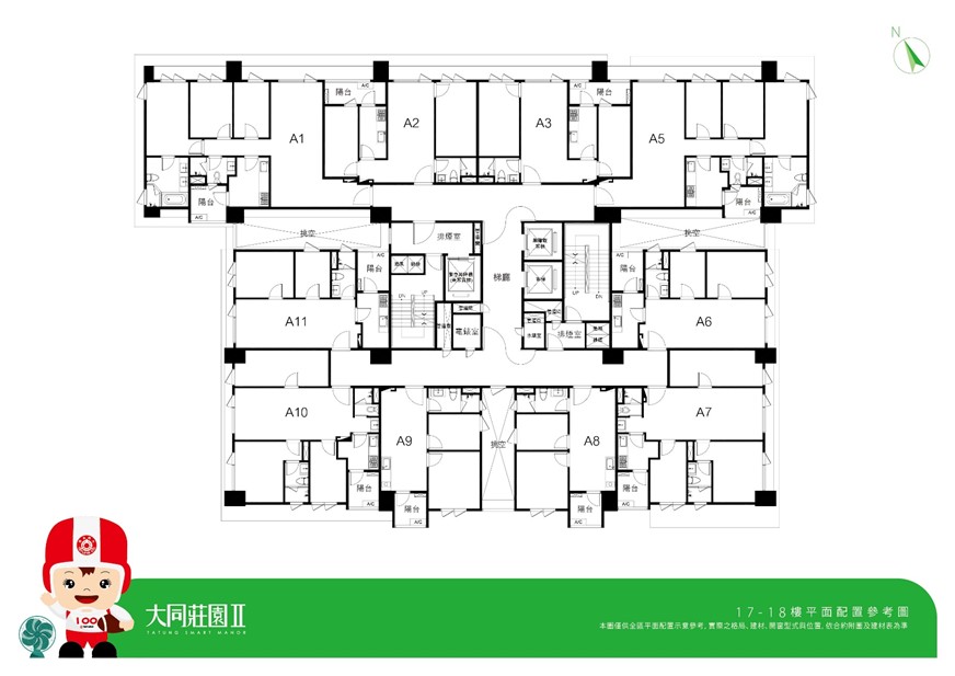 由樓層配置圖可以清楚的看見,每一層共有十戶,每戶皆有敞亮的對外大窗,且設有雨遮,但雨遮沒有登記為權狀內的坪數,使戶內坪數更加實在。排風管的設計也是設定戶戶當層排氣,衛浴開窗並搭配暖風機完全不潮濕。