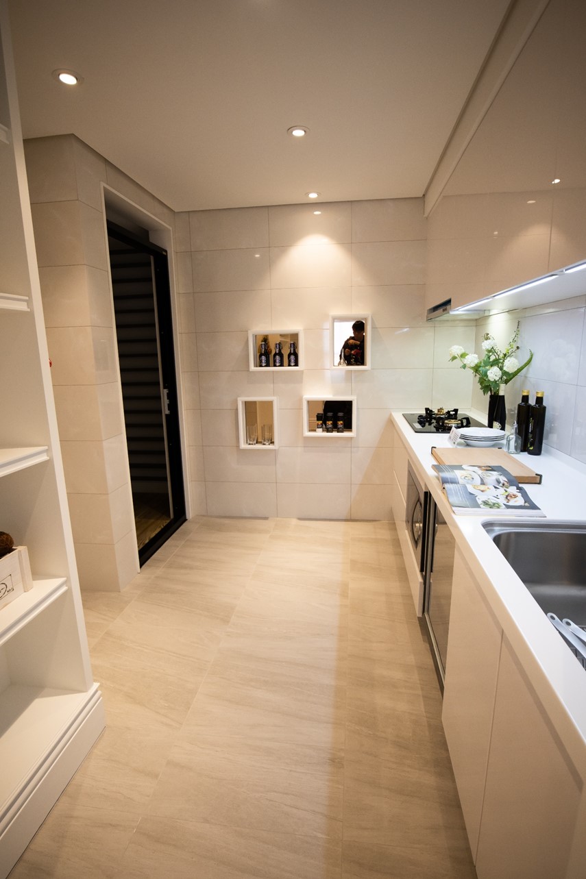 相比起前面介紹的 A11 房型,有著更寬敞的廚房空間、雙排櫃設計讓所有電器歸位都方便。對於愛下廚的女主人來說,絕對是一個堪稱完美的廚房。