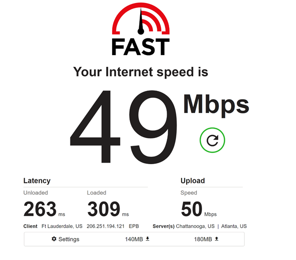 而實際透過電腦的 Chrome 瀏覽器,安裝 NordVPN 的專用外掛,連線到美國伺服器後,透過 fast.com 來進行測速的話,實際測得速度為下載 49mb,上傳 50mb,同樣的用來對付最耗網路的串流影音服務是不成問題的。